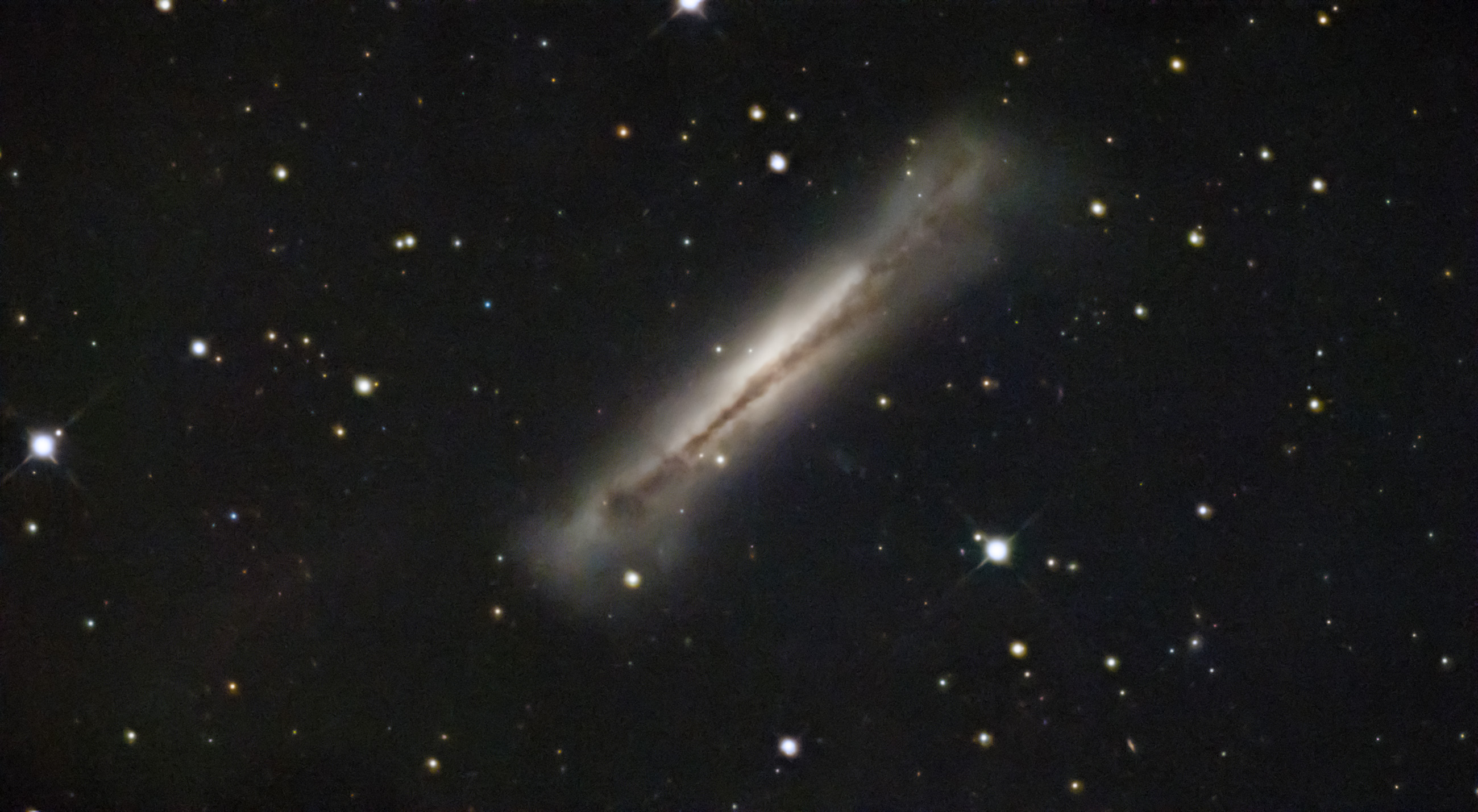 One from last night's session, the "Hamburger Galaxy" (NGC 3628) is a spiral galaxy, about 35 million lightyears away in the constellation Leo. We're seeing it edge-on from our perspective on our planet. Imaging notes: April 11, 2026 astro session in the backyard, CarbonStar 150 imaging Newtonian (600mm FL, f/4), ZWO ASI715MC camera (gain 0, 2x2 binning), ZWO AM5 EQ mount, 83 3-minute subs stacked in PixInsight 2x drizzle, 12 dark calibration frames. I think the combination of binning and drizzle makes this scope and camera combo work.