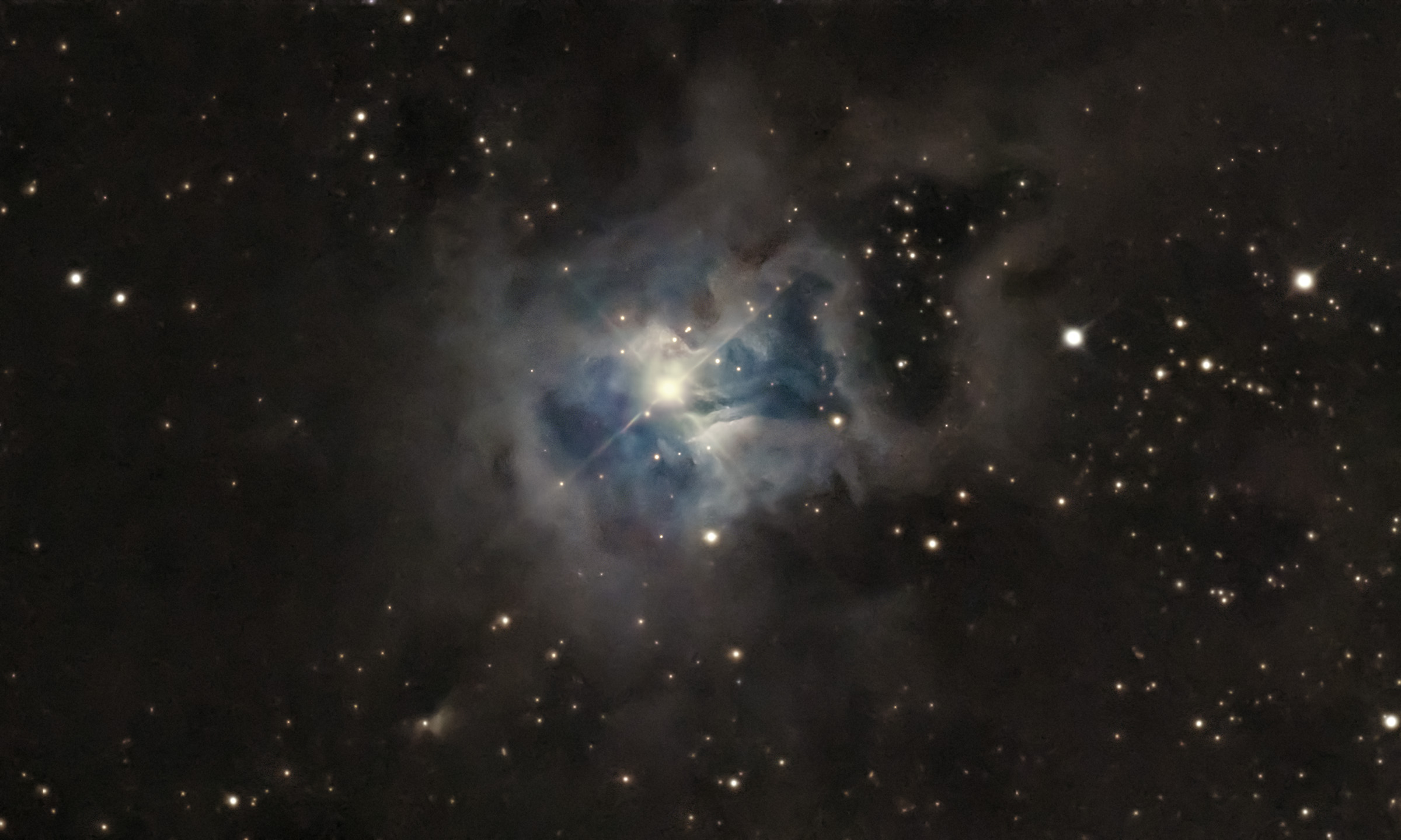 I started capturing imaging data for the Iris around 2 in the morning, and ended up with 61 good subs around 4:45am. The Iris Nebula (LBN 487, NGC 7023, Caldwell 4) is about 1300 lightyears away in the constellation Cepheus. Imaging notes: April 11, 2026 astro session in the backyard, CarbonStar 150 imaging Newtonian (600mm FL, f/4), ZWO ASI715MC camera (gain 0, 2x2 binning), ZWO AM5 EQ mount, 61 3-minute subs stacked in PixInsight 2x drizzle, 12 dark calibration frames.