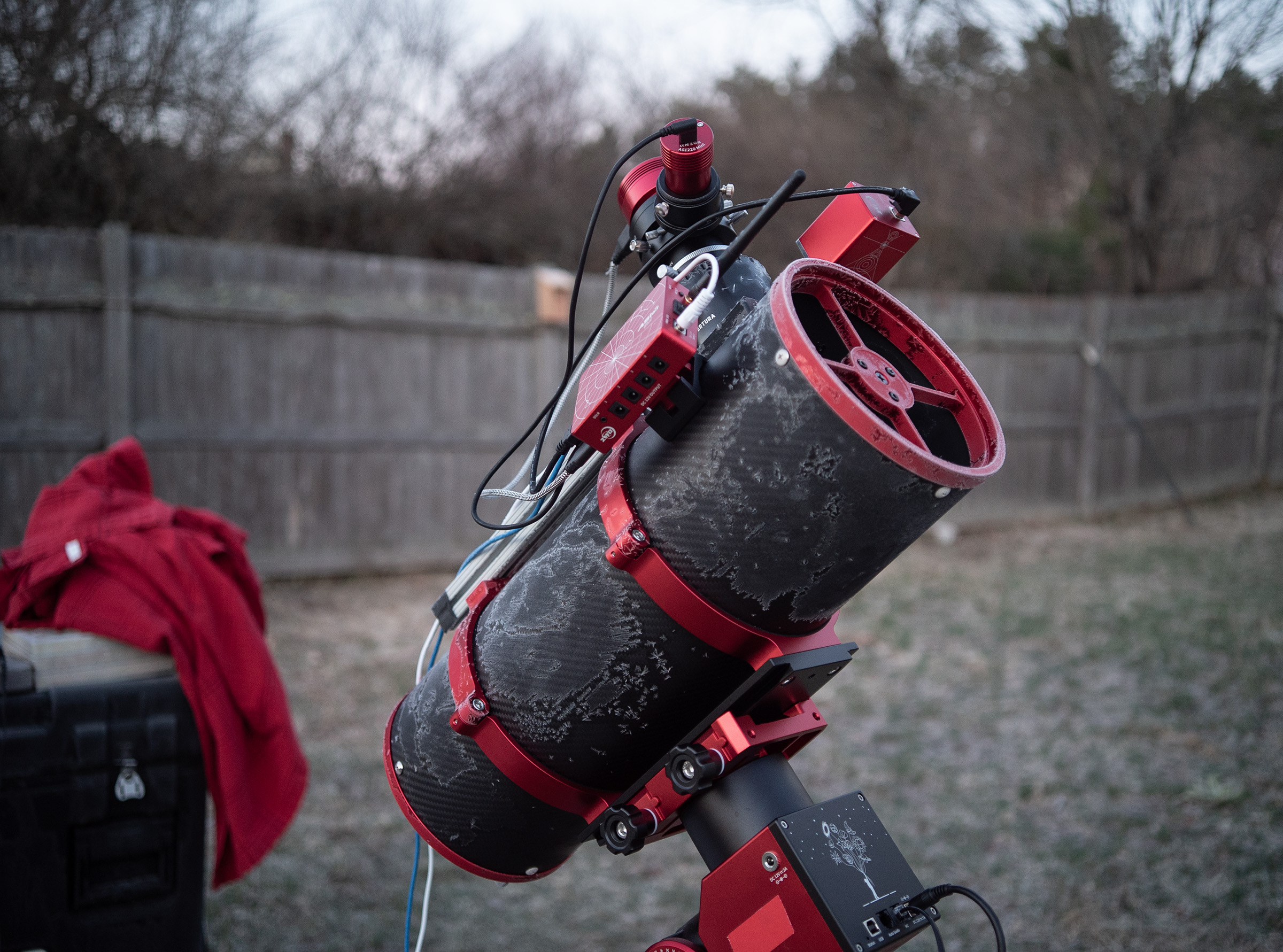 A little frosty this morning after the imaging session. I'm still using the same mismatched (sort of) setup, with the Carbonstar 150 (600mm fl) scope and the ZWO ASI715MC camera. I spent the entire night capturing 120-second subs of M101, the Pinwheel Galaxy.