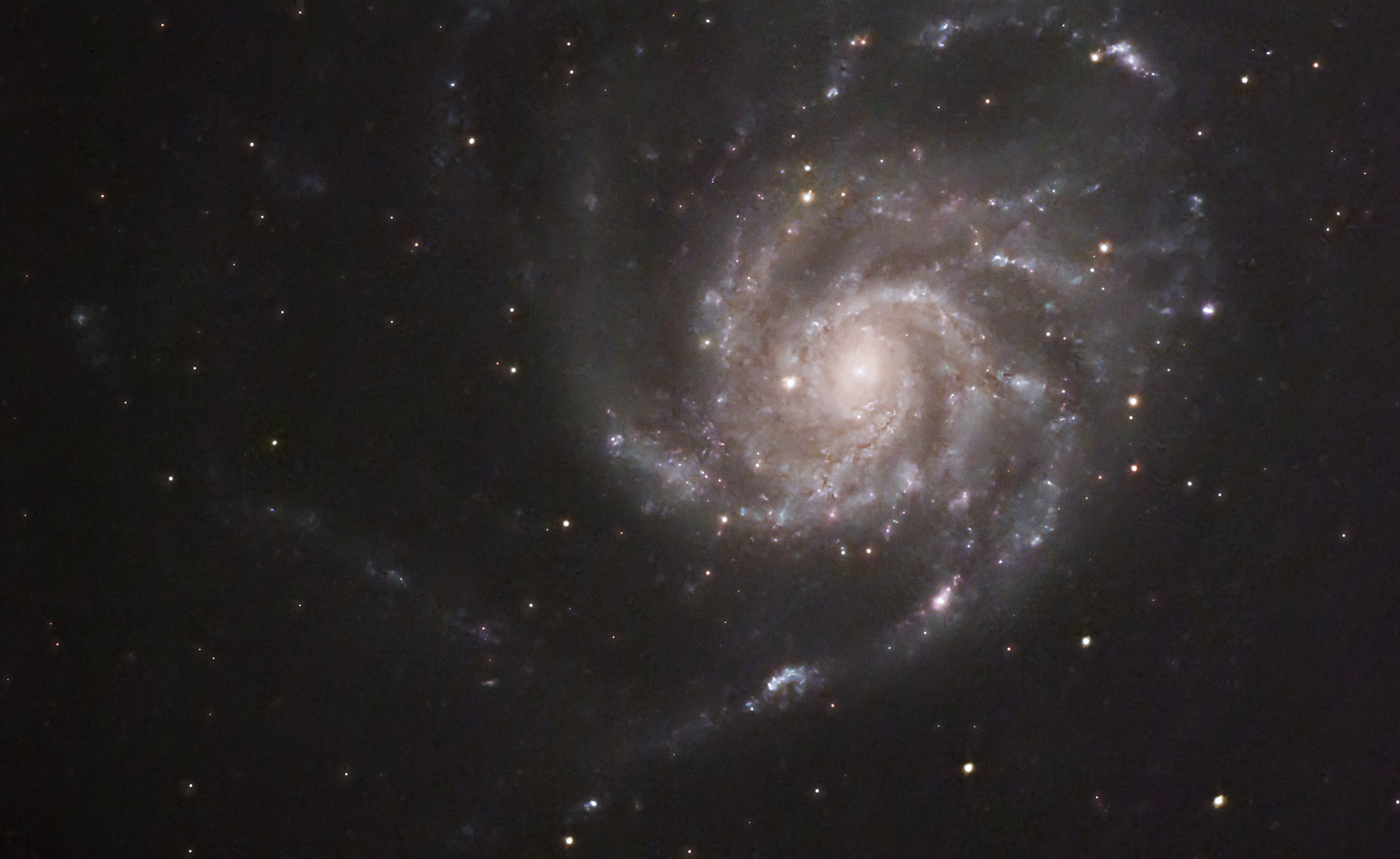 Galaxy M 101 (NGC 5457), the "Pinwheel Galaxy" in the constellation Ursa Major (Big Dipper) is over 21 million lightyears away from us. M101 is almost twice the size of our galaxy, the Milky Way, with over a trillion star systems. Imaging notes: This image is from the April 8, 2026 astro session in my backyard, Apertura CarbonStar 150 imaging Newtonian (600mm FL, f/4), ZWO ASI715MC camera (gain 0), ZWO AM5 EQ mount, 160 2-minute subs stacked in PixInsight, no calibration frames.