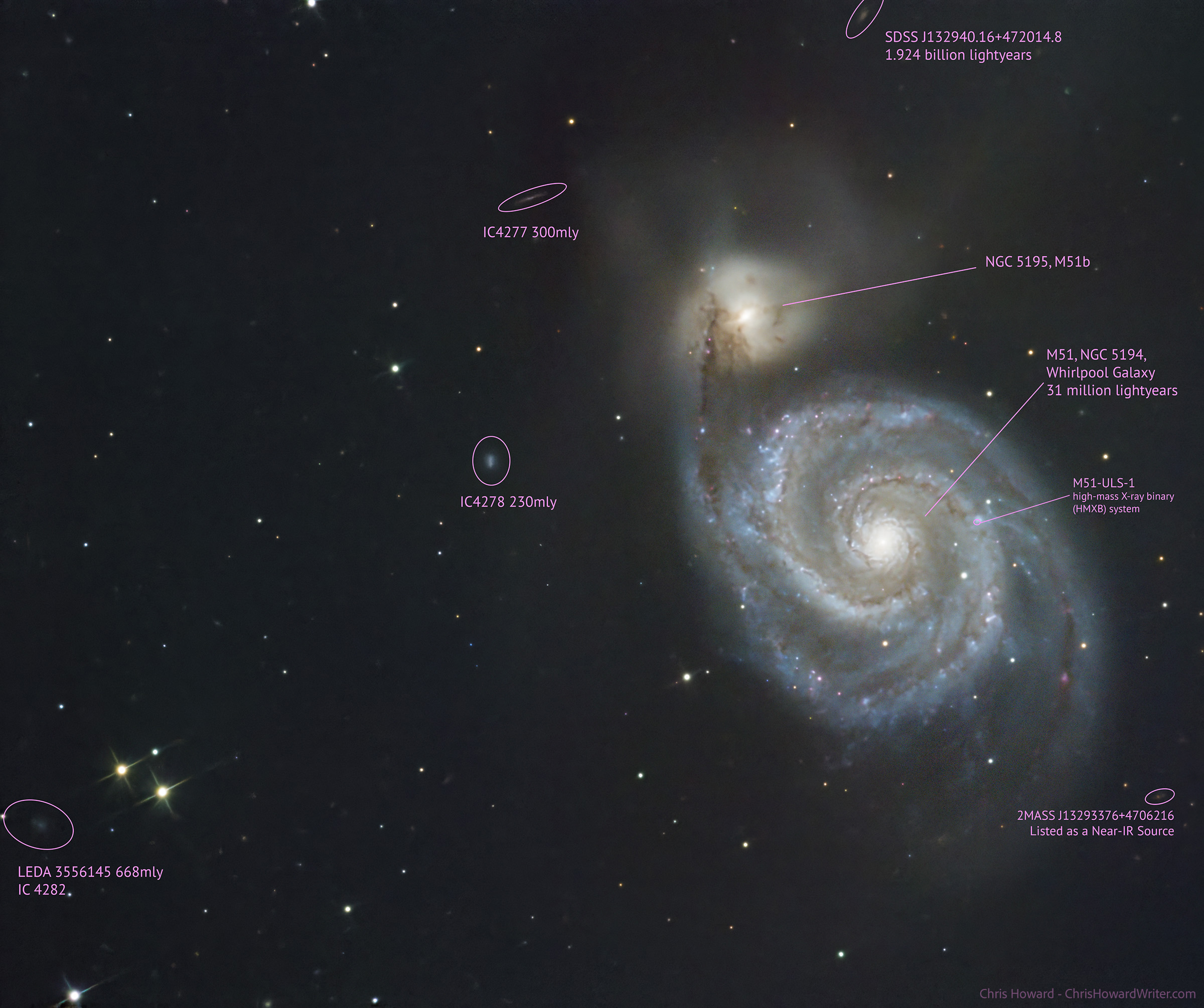 SDSS J132940.16+472014.8, 2MASX J13294019+4720147, USNOA2 1350-08286567, PGC 3556035 1.924bly, mag 18 galaxy (top, middle, above M51, almost out of frame), http://ned.ipac.caltech.edu/cgi-bin/nph-objsearch?search_type=Near+Position+Search&in_csys=Equatorial&lon=13+29+40.19&lat=+47+20+14&radius=0.1