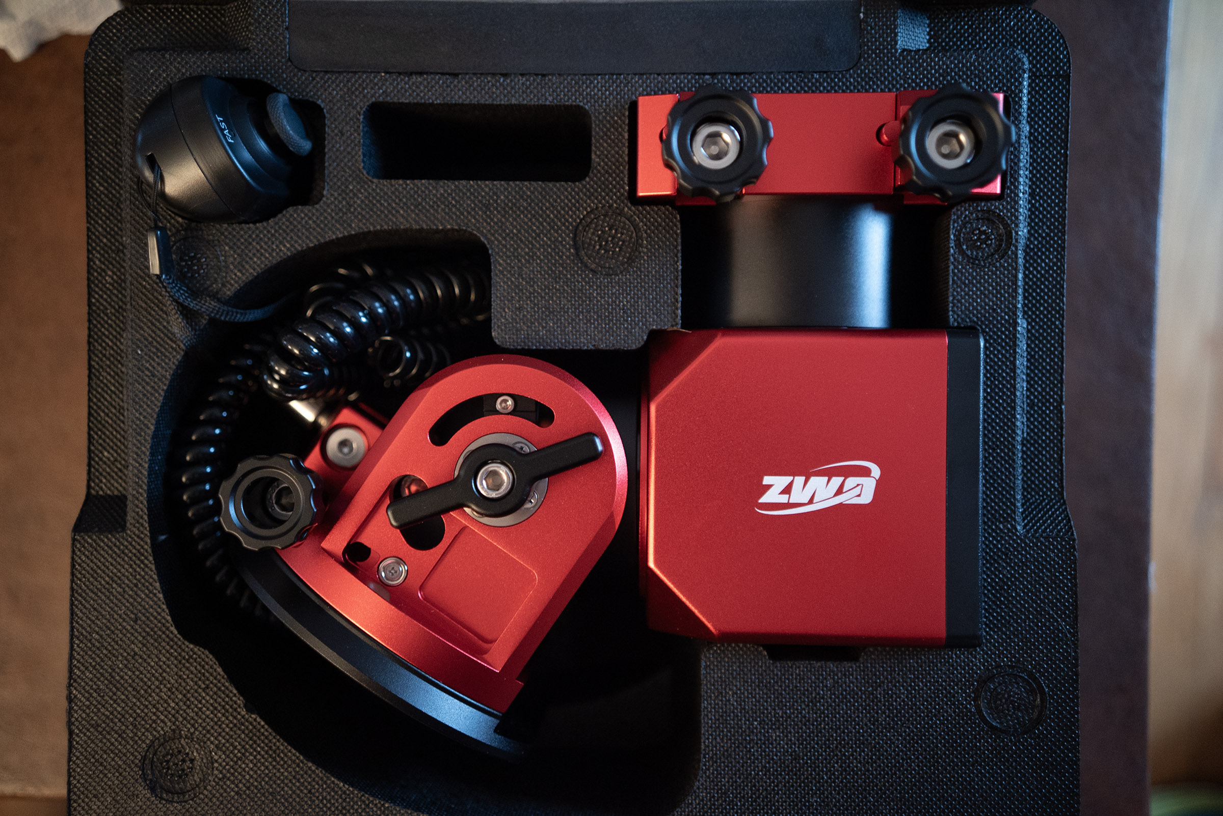 I think this is the final component needed to complete my super portable astro rig. I now have a new EQ mount, the ZWO AM3N. I bought this last week and it showed up last night. I've been using ZWO mounts for almost five years. I pre-ordered the original AM5 when it was announced in 2021. The AM5 has always been an amazing mount, and this one, the AM3 is its little brother, smaller but still very capable with the same strainwave (harmonic drive) gearing. It only weighs 3.9kg/8.6 pounds but can handle up to 13kg/28 pounds of astro gear. (Not planning to get anywhere near that). My plan is to be able to have a full ultra-portable setup, with EQ mount, William Optics RedCat51 refractor, cooled camera, and power in one medium-sized backpack. The AM3 mount will be the heaviest component, with a 20-30Ah LiFePO4 battery second, coming in around 3kg. I powered it up last night, changed the access password, updated the mount firmware to the latest, and then played around with slewing to different targets, letting it track for a bit before returning to its home position. Everything behaved flawlessly. Can't wait to get this under clear night skies!