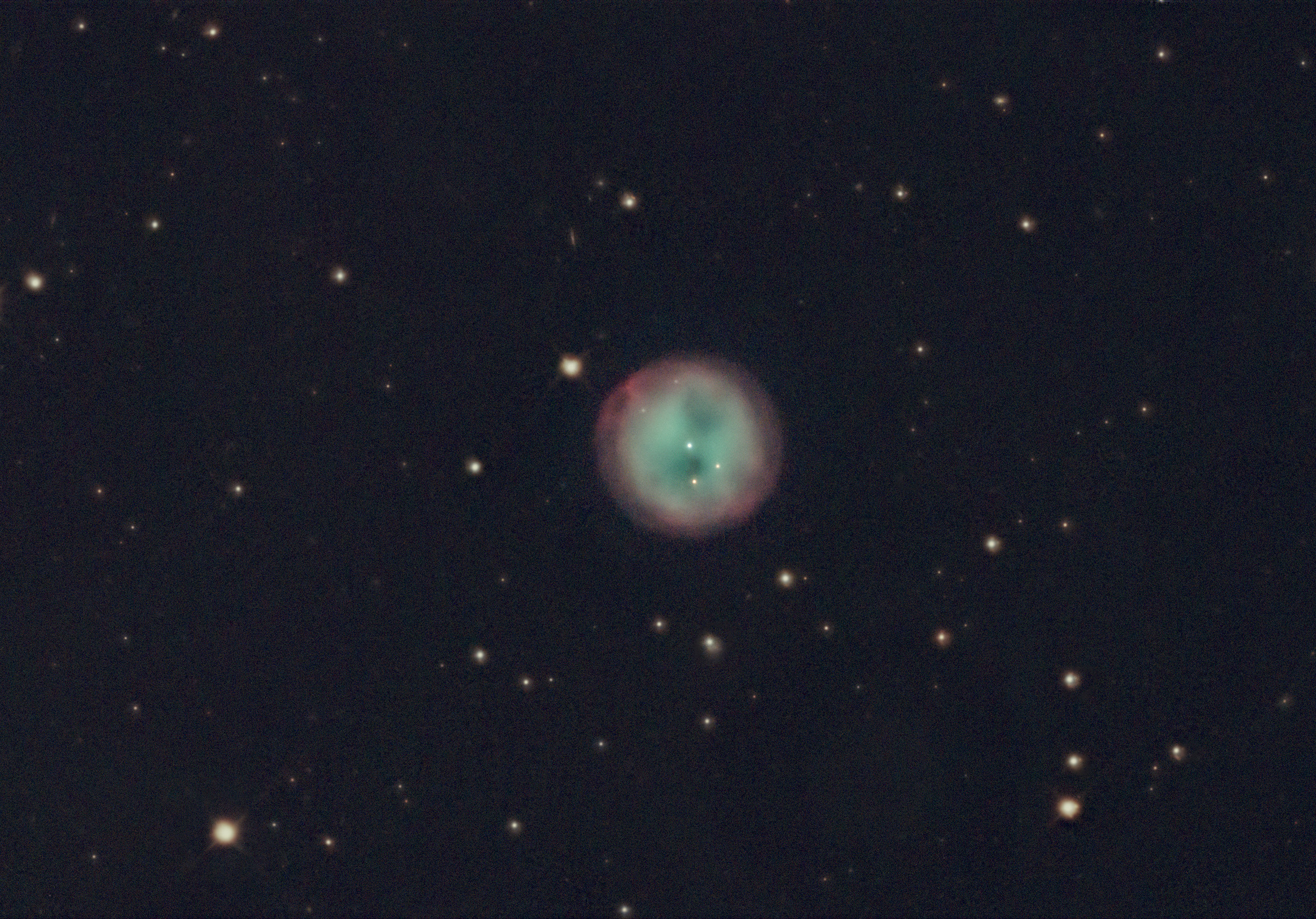 The “Owl Nebula”, M97 (NGC 3587) is a planetary nebula in the constellation Ursa Major (Big Dipper), about 2000 lightyears away. The Owl is relatively new, forming in the last 8000 years or so from a small to medium sized star, ejecting ionized gasses, including hydrogen, helium, nitrogen, oxygen, and sulfur, toward the end of its life. This image is from my April 9, 2026 astro session in the backyard, CarbonStar 150 imaging Newtonian (600mm FL, f/4), ZWO ASI715MC camera (gain 0), ZWO AM5 EQ mount, 129 3-minute subs stacked in PixInsight, no calibration frames.