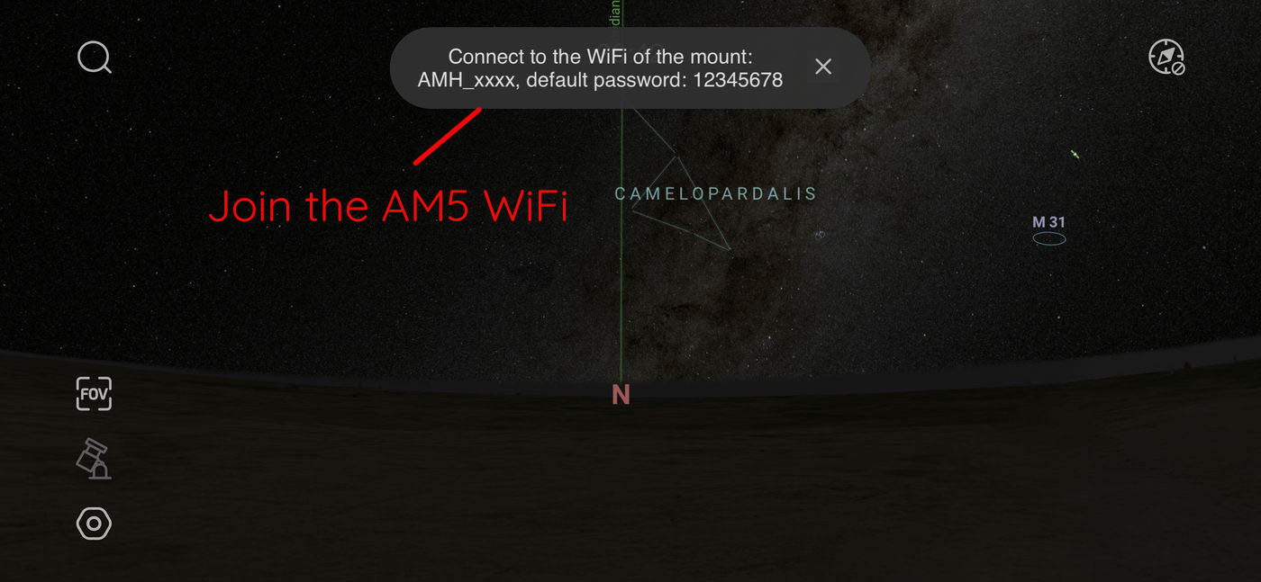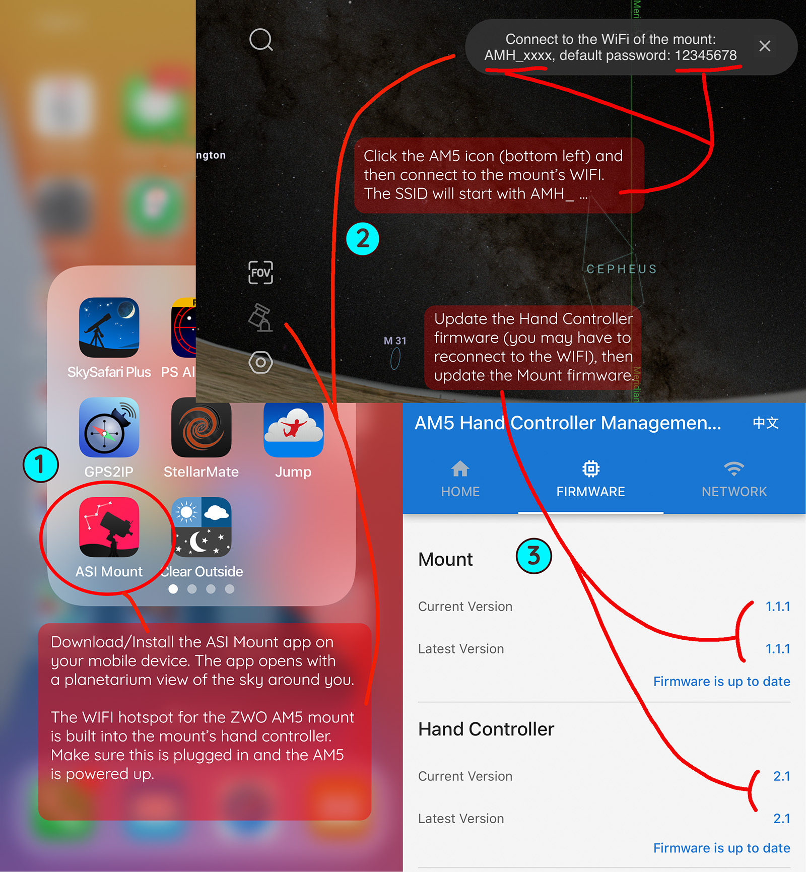 One of the first things I did after powering up the new mount, was to check the ZWO ASI Mount iPhone app, which instructs you to connect to the WIFI hotspot provided by the AM5 (built into the hand controller). I then upgraded to ZWO AM5 firmware version 1.1.1 and Hand Controller version 2.1. This took the mount from version 1.1.0 and the hand controller went from 2.0 I believe--so point release and minor release.