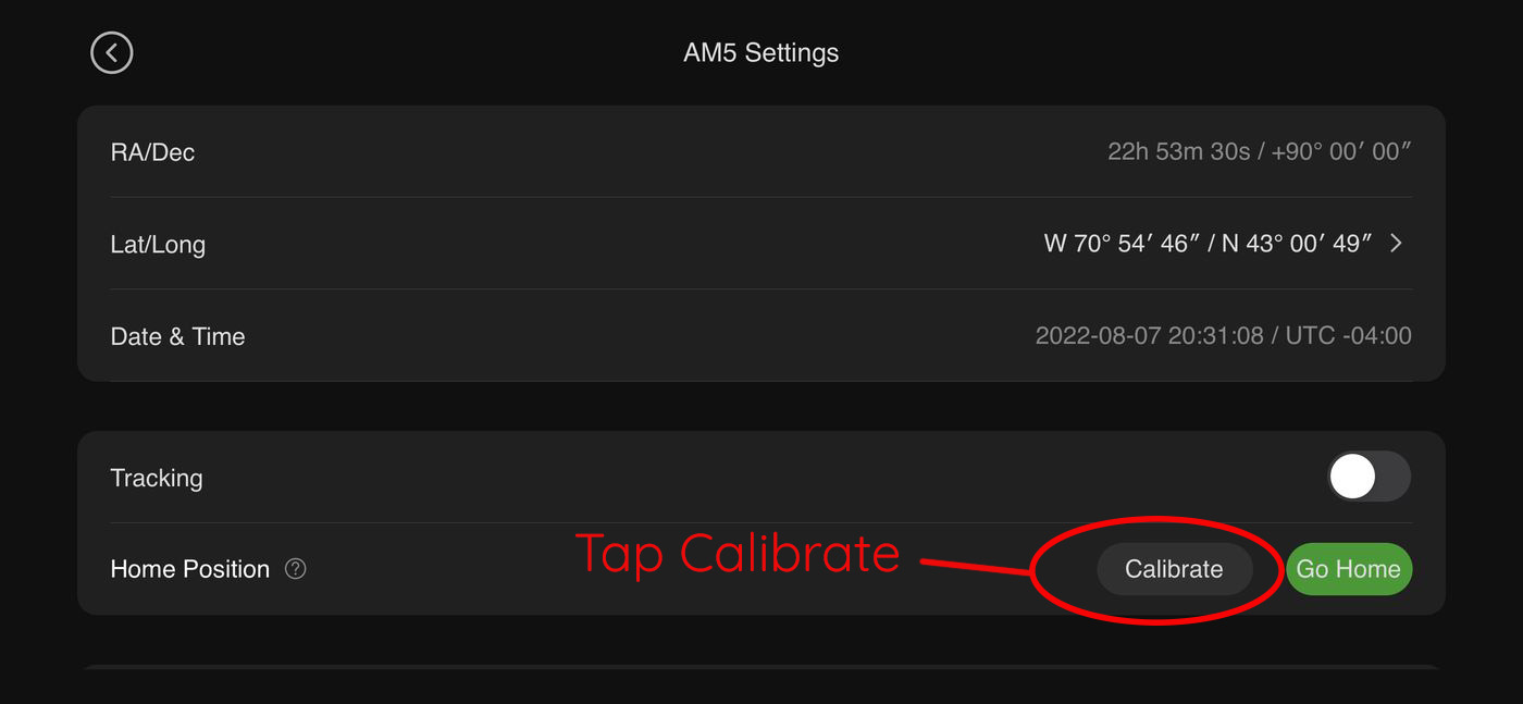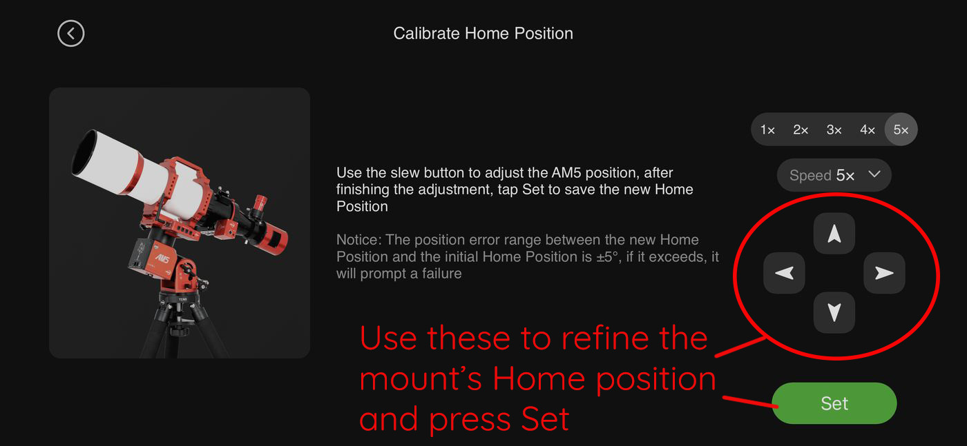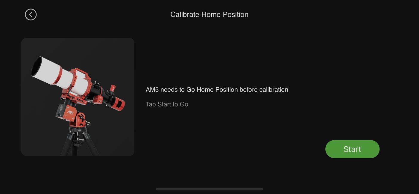 Out of the box the DEC axis of my AM5 was a few degrees east, not lined up with the RA axis. There may be several ways to reset the home position, but I used the ASI Mount app on my phone. Plugged in the AM5 hand controller for wifi, connected to AMH_..., and when you tap the AM5 icon at the lower left, there's a "Home Position" in AM5 Settings. Tap "Calibrate" (it will move to what it thinks is home first), then you can adjust the DEC/RA with the buttons in the app (or maybe with the hand controller) and tap "Set" to save that position in the AM5.