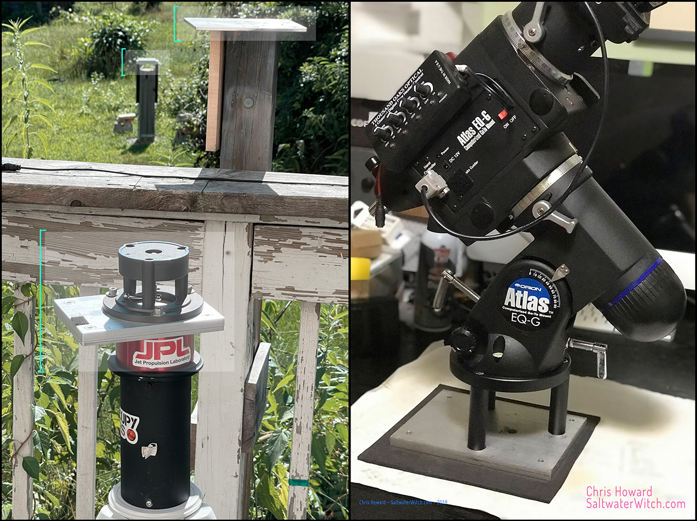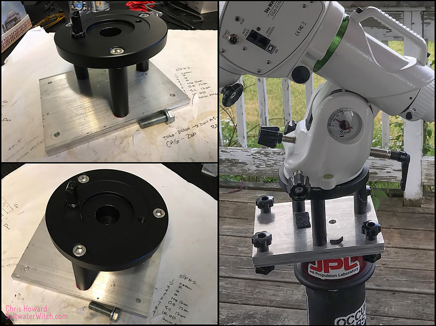 One of the first things I wanted to verify is the iOptron CEM/ZQ Tri-Pier Adapter with the ZWO AM5 mount. Looks good. (see the pic, bottom right). Over the years I have moved to one standard mounting point for my tripods and piers. I have a heavy-duty tripod, a small test pier ("winter pier") right off the back deck and my big pier about 30 meters from the house, in the backyard, and each has a 6 x 8 inch (152 x 203mm) mounting plate, drilled to accept four clamping crews. I have an aluminum plate on the mount side, and for the EQ6R-Pro and Orion Atlas I drilled and tapped holes to attach an iOptron Tri-Pier Adapter (#8036-TK), and for the CEM25p I used the #8036-25 Adapter. The CEM25p and the ZWO AM5 both use a standard 3/8 inch center mounting bolt, making this easy. No new adapters to build, and the new mount will fit with the big tripod and both piers. (I also have the ZWO TC40 Carbon Fiber Tripod for travel and I won't use the mounting plate). https://www.ioptron.com/product-p/8036.htm