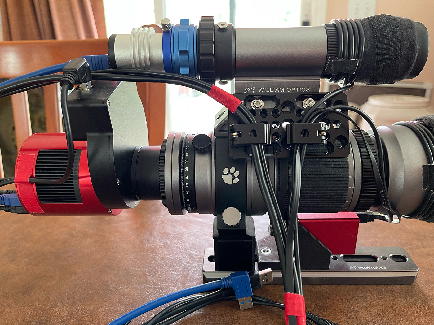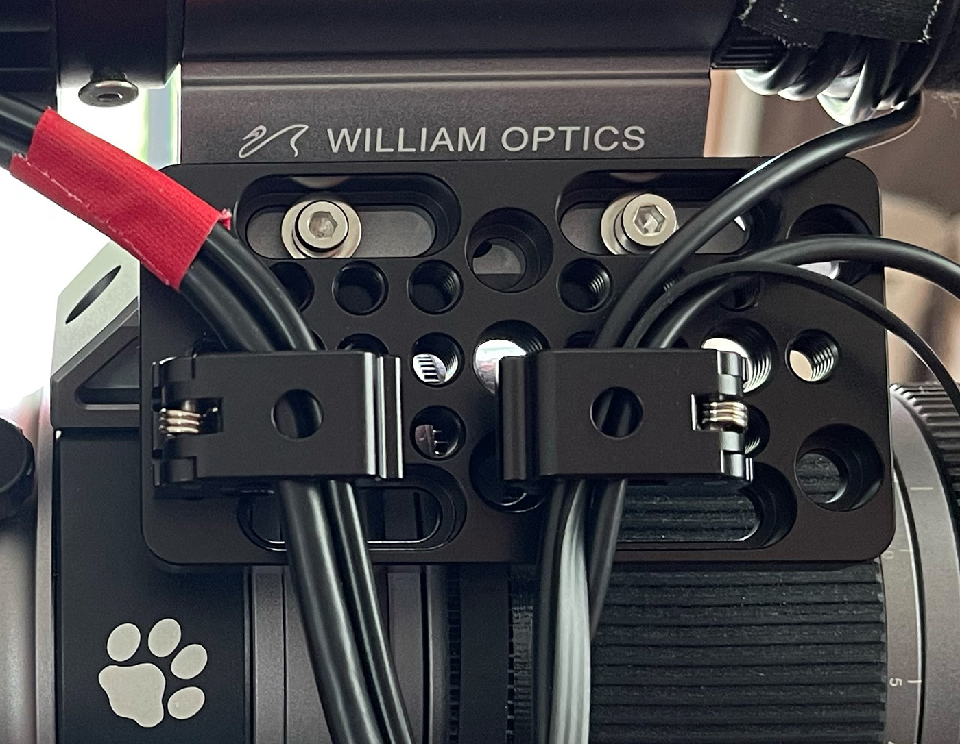 So, a little cable management was in order for the William Optics SpaceCat 51 on the ZWO AM5. The guide camera (silver camera on top) and the filter wheel plug into USB ports on the primary camera (ZWO ASI1600MM-Pro) at the back. Another USB cable runs from the autofocus (ZWO EAF), the red box under the scope. I end up with five cables leading down to the Pegasus Astro Powerbox and the fanless Windows 10 machine running the control software (NINA). What's new in these pics is the SmallRig Switching Plate (1598) and two of the SmallRig Spring Cable Clamps (MD2418). These are designed for cable management on cinema cameras, but work just as well for our gear.
