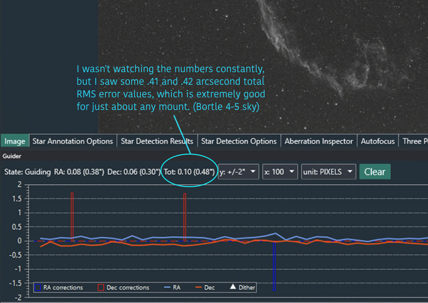 Finally, the skies weren't perfect, seeing was maybe a little above average, and the mount performed with those total RMS error numbers, .4, .5, .6 arcseconds. Amazing.