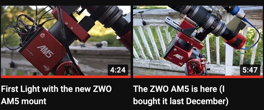 I nearly found out the hard way that the new ZWO AM5 mount is so compact that power and USB cables from the primary camera can easily loop over the altitude and azimuth adjustment knobs at the base and snag, something I never really thought about with a larger mount. This happened the other night, and I just managed to unhook them and continue imaging.