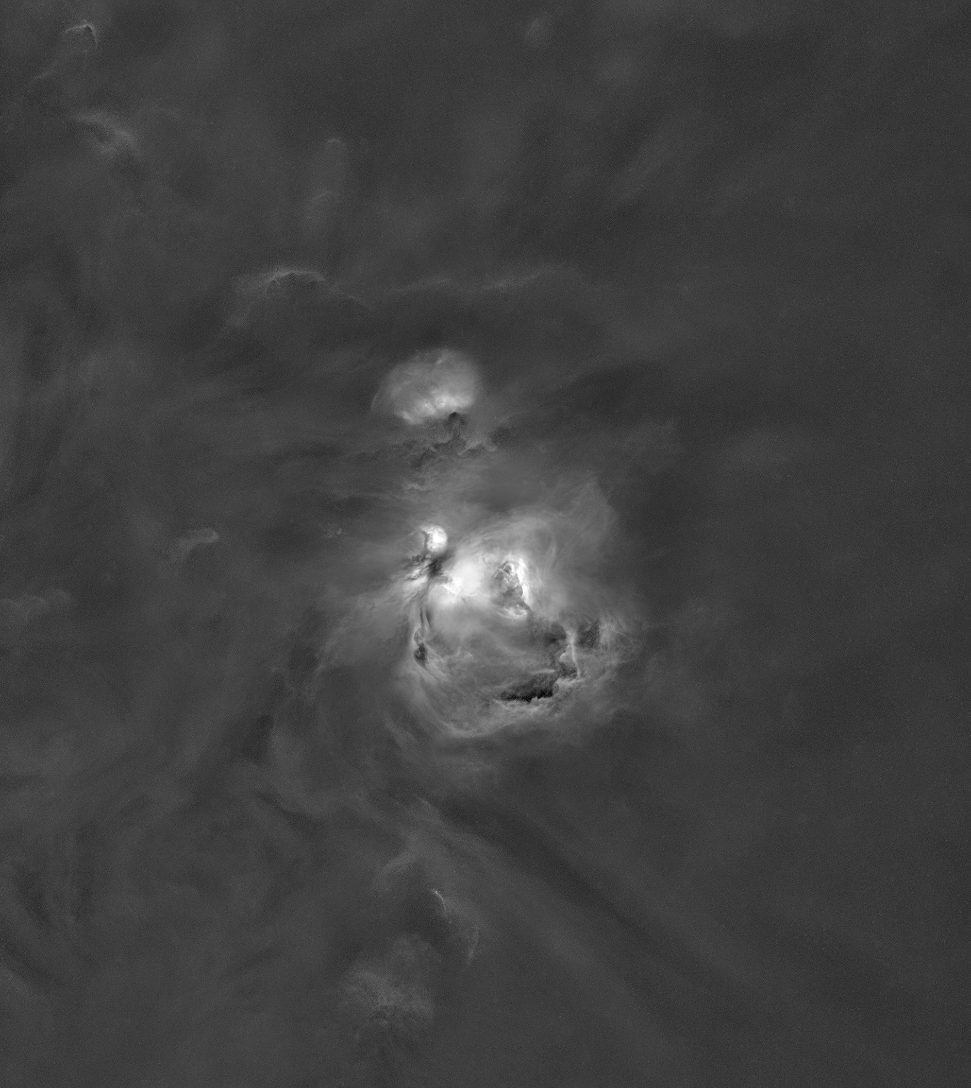 With the stars removed you can really see the hydrogen cloud structures. It is the intense radiation from those stars that drives the currents and eddies and walls of cloud. And then there's the "finger of Orion", middle left, pointing at NGC 1976, and clearly saying, "that's my favorite nebula in the whole galaxy".