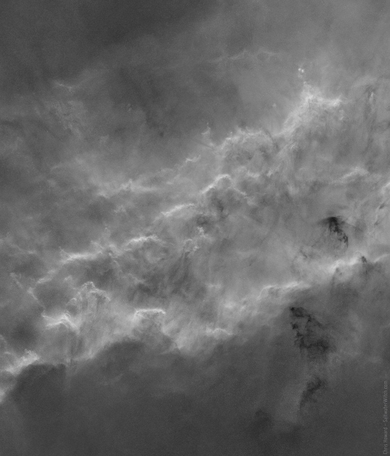 Narrowband (3 nanometer hydrogen-alpha) crop of the central region of the California Nebula (NGC 1499) in the Constellation Perseus. I used the neural-net based StarNet to remove the stars from the final image. So we're only seeing the trillions of miles of hydrogen, along with dark bands of dust and interstellar debris.
