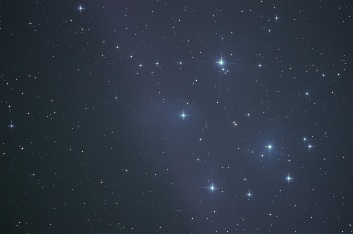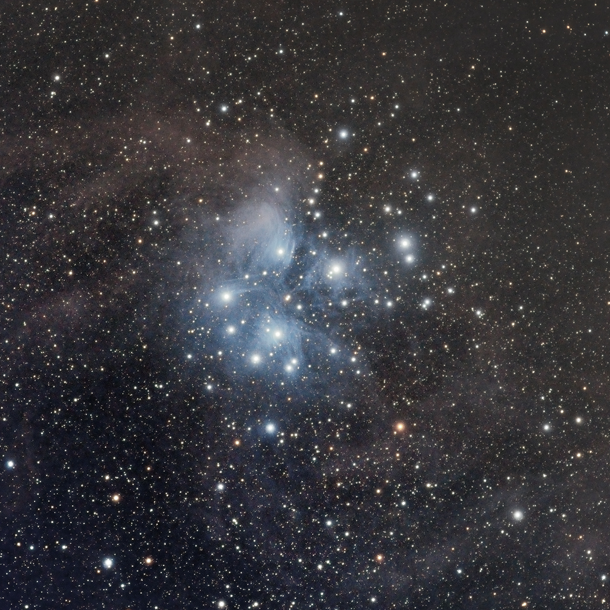 About 450 lightyears away, the Pleiades, Messier 45 is one of the most recognizable open star clusters in northern hemisphere skies. Imaging Notes: 28 x 480 + 28 x 600 second subs, William Optics SpaceCat 51 APO Refractor, ZWO ASI071MC camera, iOptron CEM25P mount.