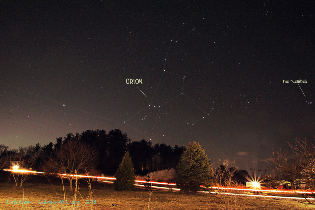 I was out for a few hours last night with the 800mm Newtonian, mostly to test out the focuser setup and get autofocus working with the AF3. I got about halfway through that--I think I have backlash accounted for, but still had some weirdness with the AF routing, and thinking that was the tension screw on the GSO focuser being too loose. In the middle of testing I kept running into wide bands of reflected light that changed from target to target--I jumped around to NGC 1499, Witches Head in Orion, and last, M45, the Pleiades. There were bands of light of various directions for all but the Witches Head, which is the only one in the southern sky.