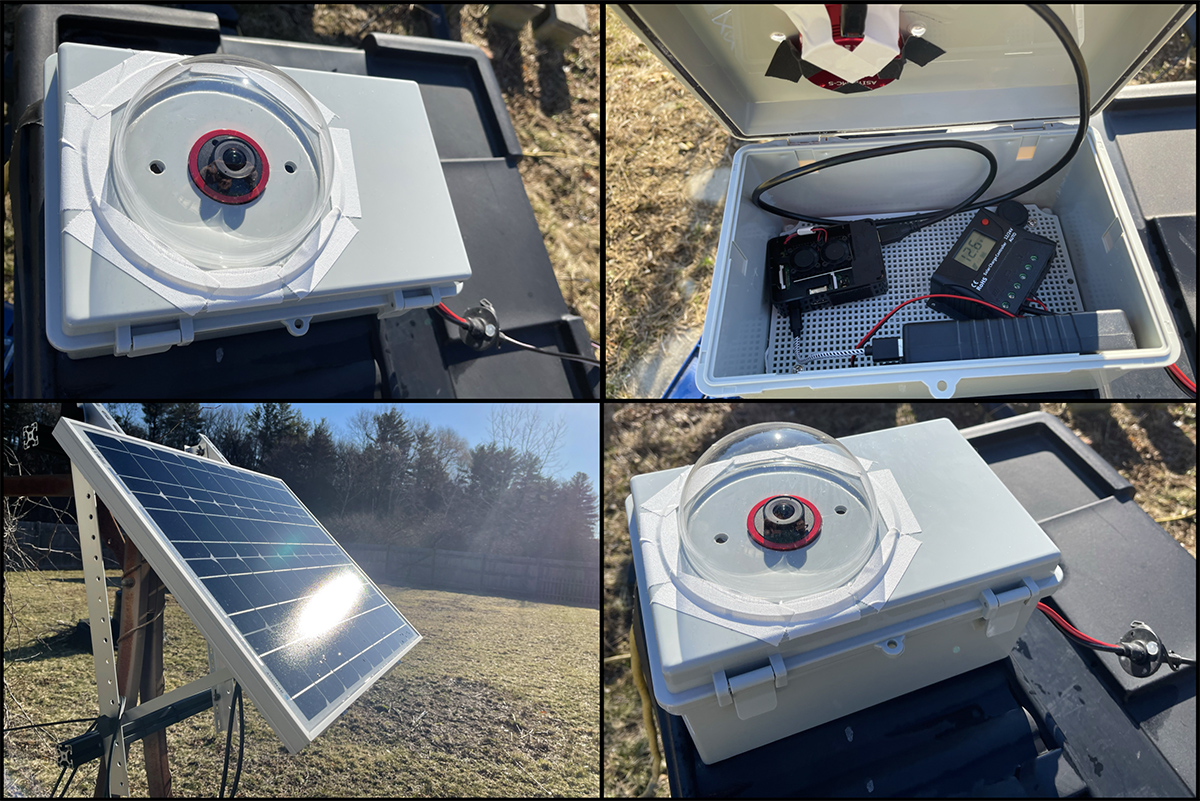 Today starts my first full test of the setup, with daylight solar charging and continuous operation. Here's the current system, with the dome taped down for now, ZWO ASI120MC color astro camera, 6mm super wide-angle lens, Raspberry Pi 3b, lithium battery, and 10 amp PWM solar controller. I drilled two holes for ventilation, mainly to test the need for separate dew control. My hope is that there's enough heat rising from the Raspberry Pi CPU fans to get warm air circulating under the dome--with enough of a temp boost to prevent condensation from forming.