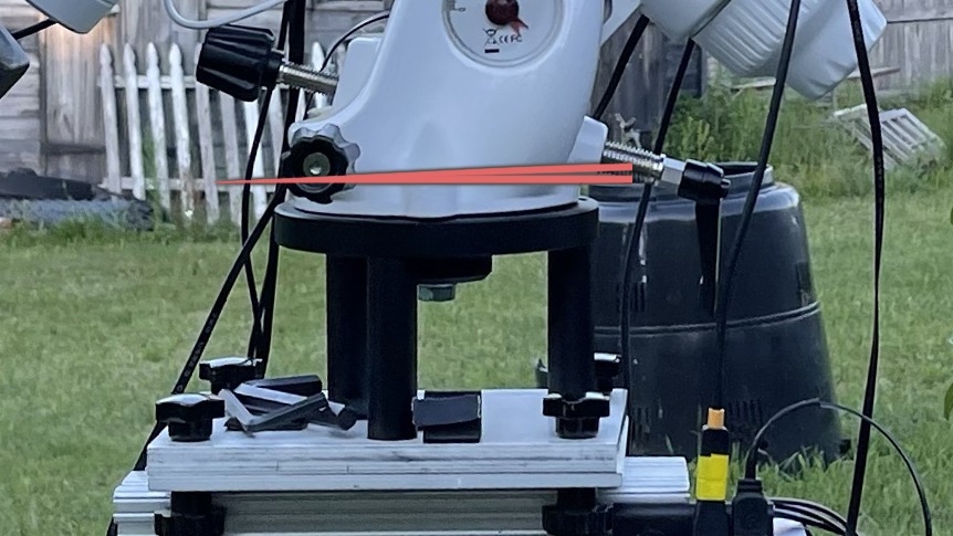 It's a gray rainy autumn day, so a good time to do a little upgrade. I ordered an ⅛" (3.2mm) thick aluminum spacer (6"/152mm OD x 3"/76mm ID) for the Orion Atlas pier adapter I use for both the Orion and the Sky-Watcher EQ6-R Pro. The Orion Atlas sits perfectly flat in the machined center and cut out ring, but the EQ6-R Pro sits slightly higher because the depth of the center is probably millimeter too shallow. Although the center bolt held it in place, the EQ6-R Pro always sat at a slight angle. I never liked that. Time to fix it with an aluminum spacer. I drilled a hole for the azimuth post, and we're back in business!