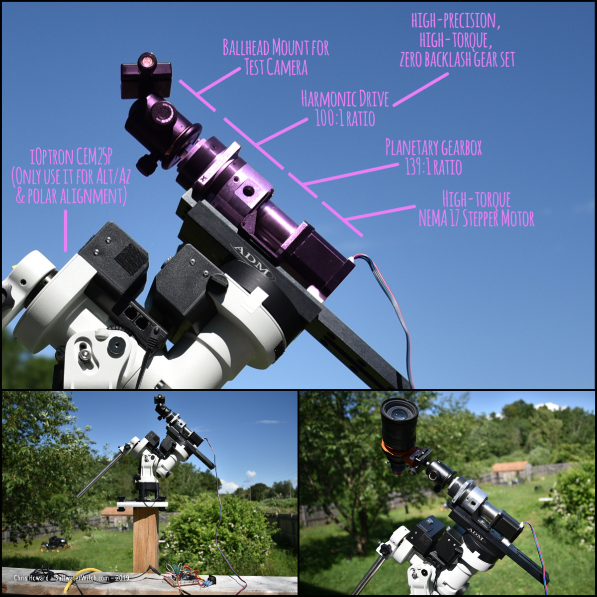 AstroTrackHD Prototype v4.2 is ready for testing! HD = Harmonic Drive, which is a high-precision, high-torque, zero backlash gear set. See: https://youtu.be/3mWemlMEzFk). The main update with version 4.2 is stepper driver support for interrupt-driven motion, with the ability to set the speed in milliseconds / 1 rotation--"clock mode". This enables me to set the speed equal to one sideral day-with all the gear ratios calculated in. One day in sideral time is 86164.091 seconds, and with a 139:1 ratio gearbox that gives me 619.885 seconds / full rotation. Then on top of this I have the harmonic drive with another 100:1 ratio to calculate in. I'm going to try this out with a camera tonight!