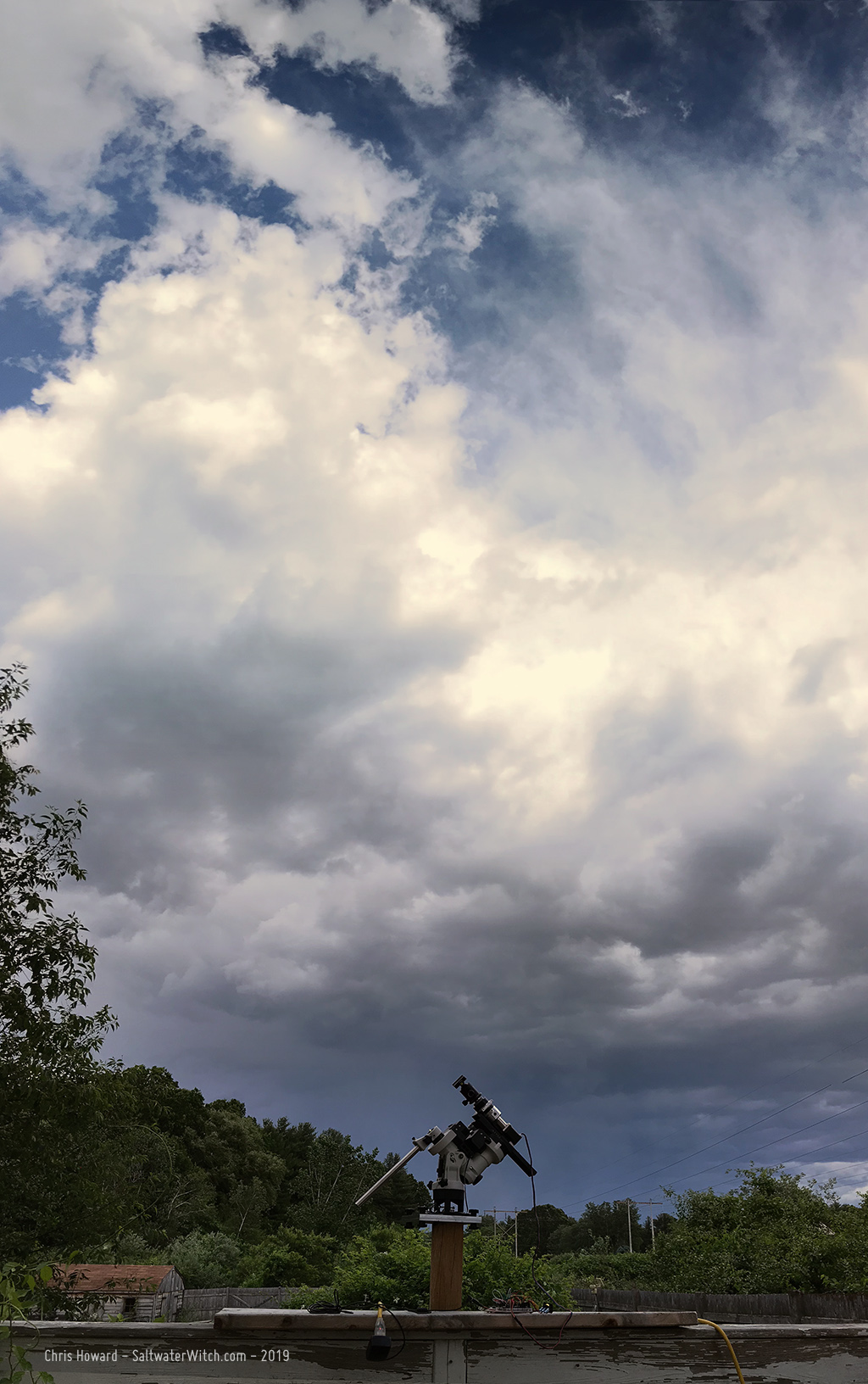 I didn't spend much time on testing last night. The sky was was clear, but seeing was poor. I put the Nikon D750 on the tracker and took a batch of 30 second exposures around 11pm--48 of them, with the tree in the frame. (I cropped some of it out, as well as the edges). Stacked them in DeepSkyStacker and did some processing in PhotoshopCC.