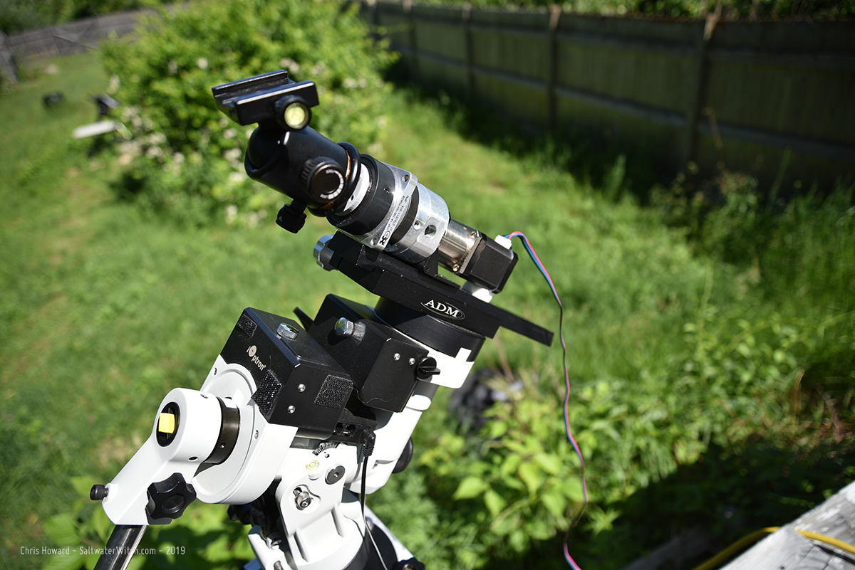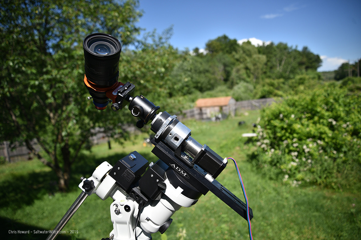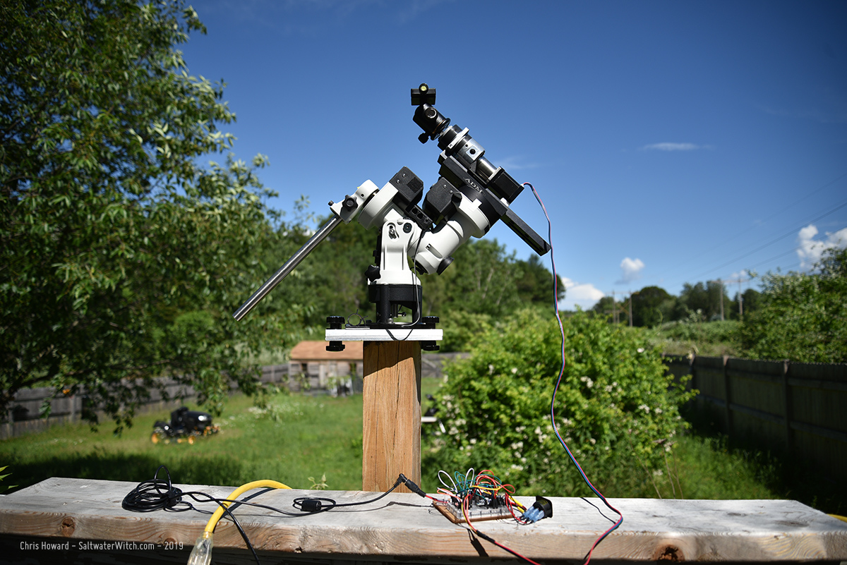 Here's the test in progress, with the Nikon D750 on the tracker and the electronics--arduino and A4988 controller--on the board below, taken with my iPhone.