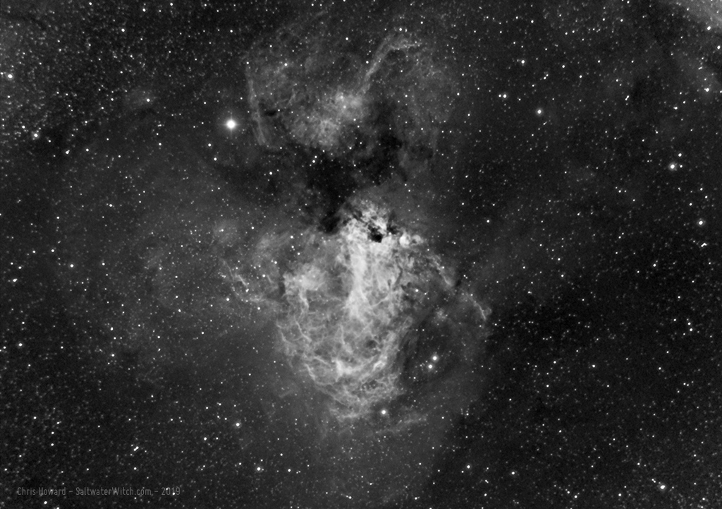 The Swan Nebula (M17) in Hydrogen-alpha (16 x 5 minute exposures with the WilliamOptics ZS61 and Atik414EX mono CCD camera). Reprocessing a set of frames I shot almost a year ago. You can really see the swan in this shot. Messier 17 is also called the Omega Nebula, but I see a swan, and I don't see an Ω. Not really, maybe that loop at the top, the swan's arched neck?