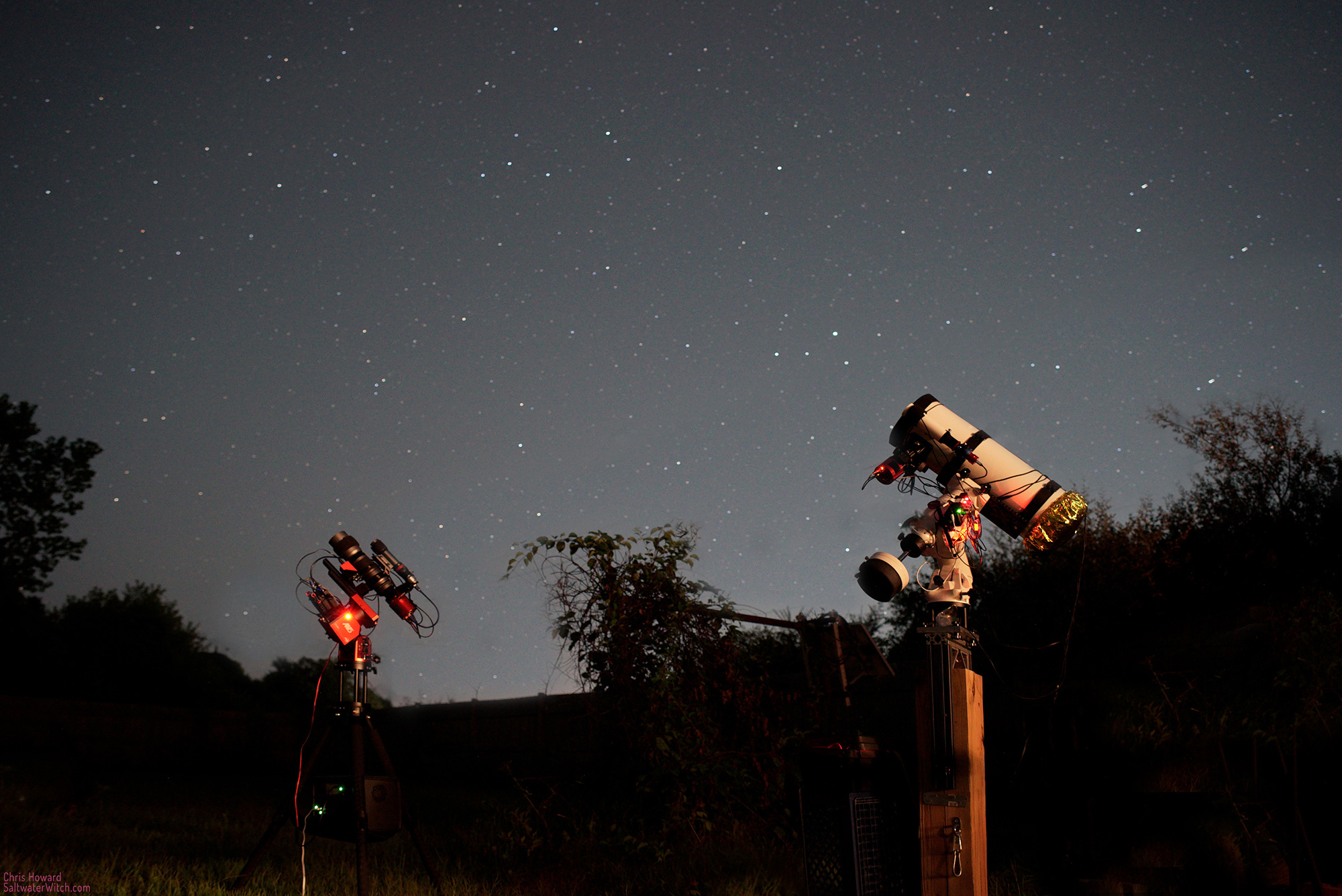 A shot of my backyard last Friday. It was nice and clear, and I ran both imaging systems, the 250mm monochrome camera and narrowband (NGC 281, Pacman Nebula in Cassiopeia), and the 800mm with filtered RGB color (M33, Triangulum Galaxy).