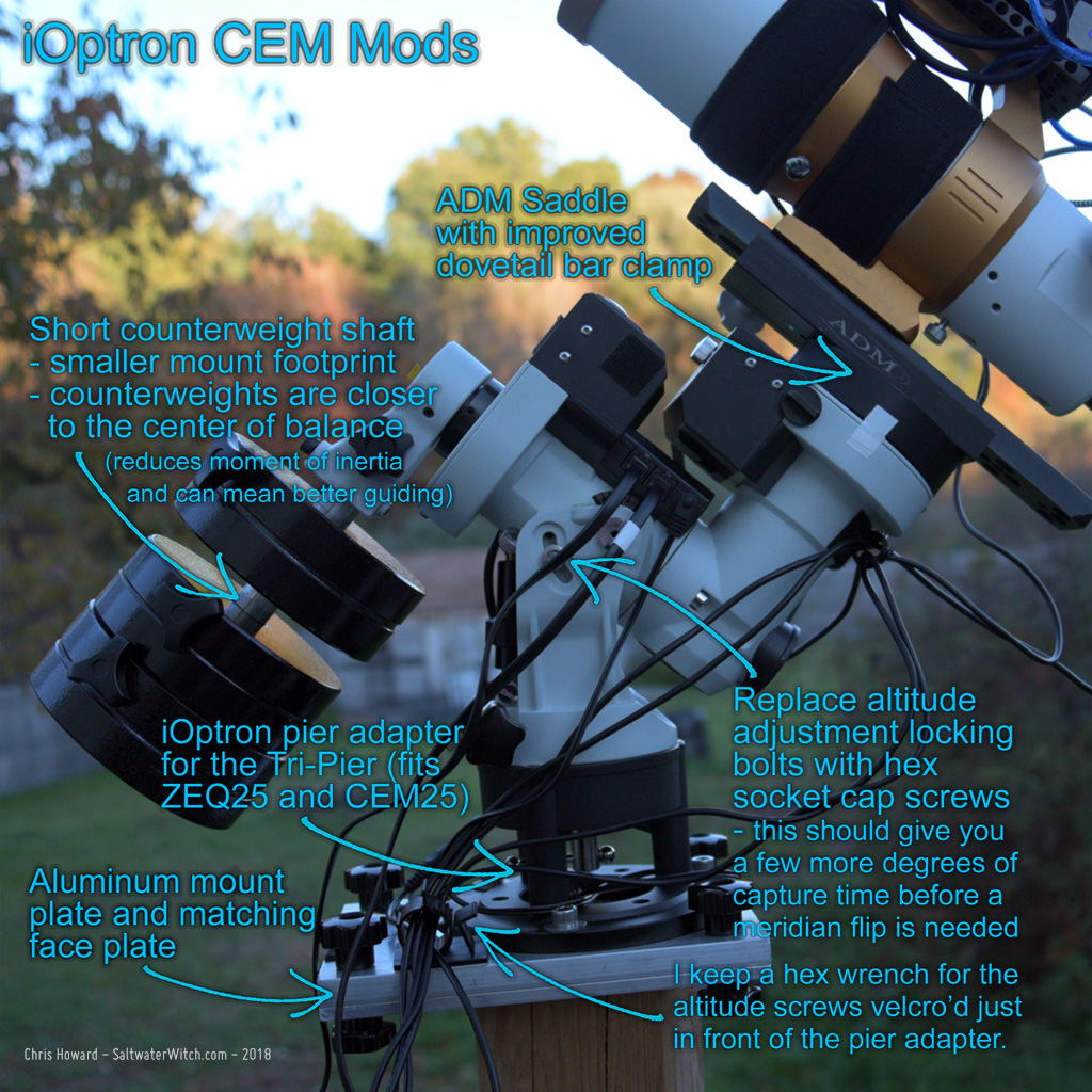 I put together a list of modifications and upgrades I have added or built for my IOptron CEM25P mount, and included them in one handy image--with arrows and descriptions (see below). Over the last year this has become my primary telescope mount (over my Orion Atlas EQ-G), partly because I've been doing most of my astro-imaging work with 81 and 61mm aperture refractors (that's a William Optics GT81 in the upper right). The other advantage of the CEM25P is quick setup time. I can have this bolted to the pier plate, polar aligned, and ready to image in about five minutes.