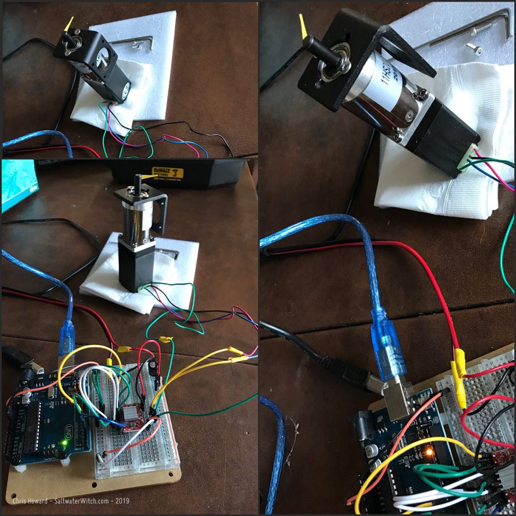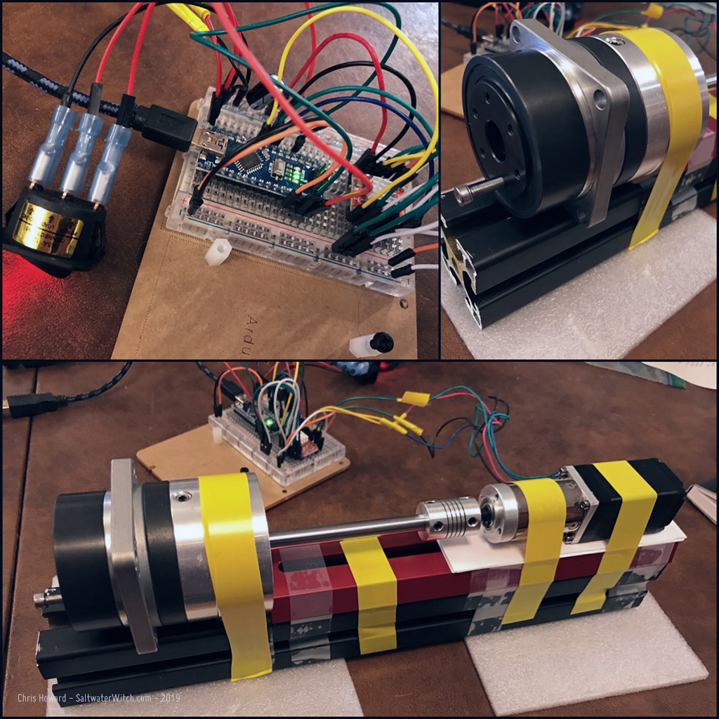 Here's the latest component and wiring setup, driven by an Arduino Nano and A4988 Stepper Driver, with the whole thing running off a single 12vdc power supply. The bottom frame is the entire rotation test taped together and functional.