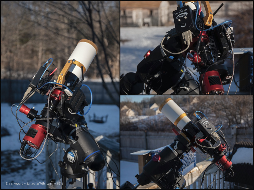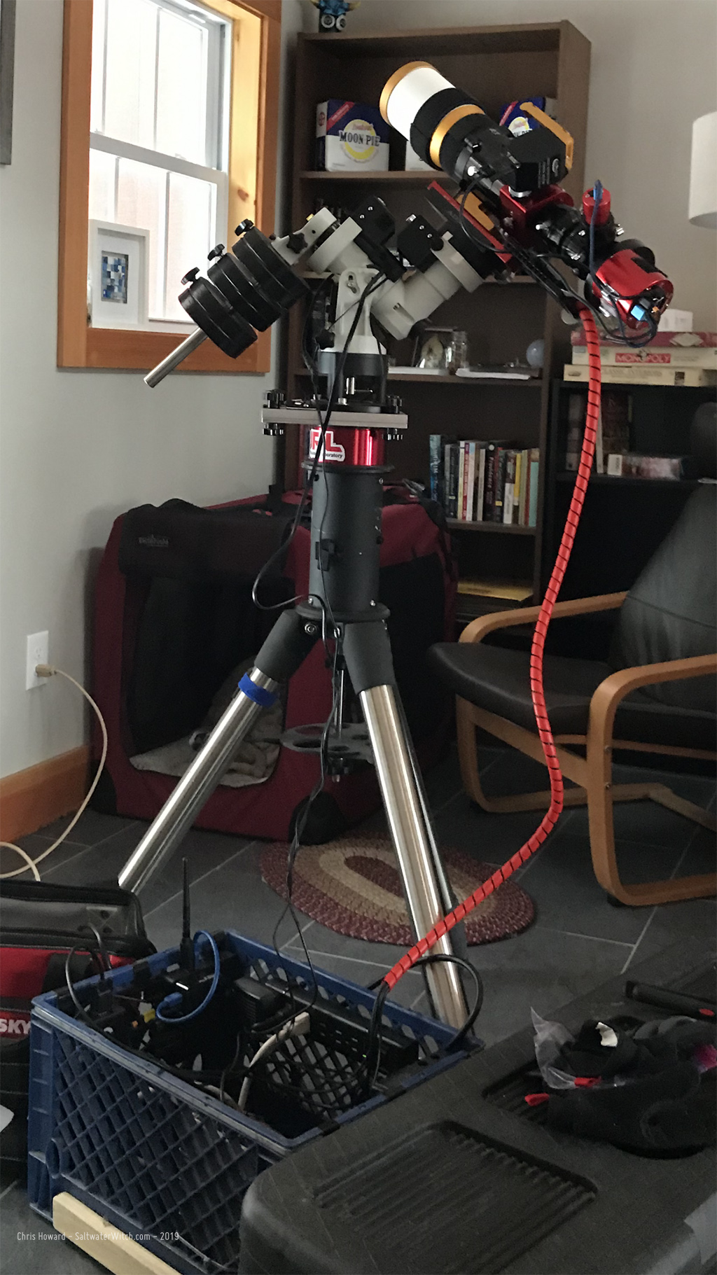 In the field--well, not really, but I was a little under a 100 miles away in western Massachusetts testing out the portable narrowband setup with my William Optics GT81 APO refractor, Moonlite automated focuser, ZWO ASI1600MM-Pro Mono camera, iOptron CEM25P mount. It snowed and was cloudy the rest of the time, but I did have a chance to really test out the setup away from the house, and it all worked beautifully. Unfortunately I also forgot to take my Macbook Pro, but ended up running everything from my iPhone using Jump Desktop to remote into the astro system. The weather didn't cooperate, but so what? We had such a fun time down at Lisa and Neil's place this weekend, and just to prove there was at least a little astronomy stuff going on, here's a pic of my setup running in the library.