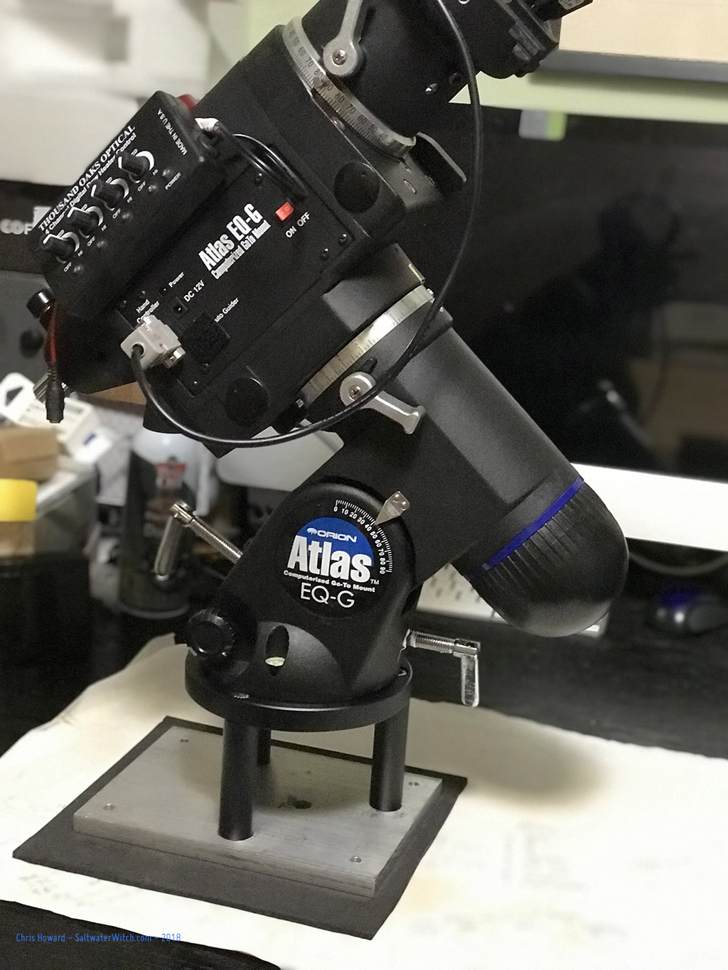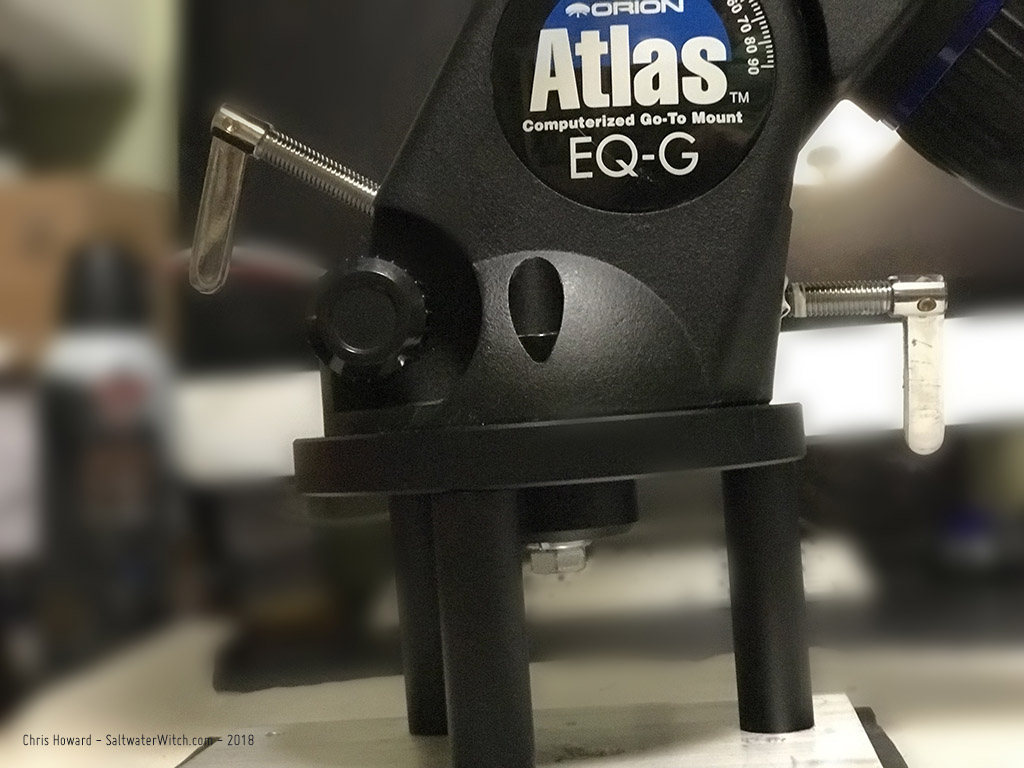 I worked on this over the weekend, but I have been planning it for a while. I now have both my mounts--Orion Atlas EQ-G and iOptron CEM25P on identical aluminum mounting plates, drilled to match the base plates on my backyard pier and my tripod. I'm using the iOptron Tri-Pier Adapter (8036-TK) for this. It comes with the heavy duty aluminum upper plate (connected to the mount), three posts, and stainless steel hex cap bolts. I drilled the aluminum plate with the same four hole pattern I use on the pier and tripod. I drilled and tapped three holes for the adapter. This thing is solid!