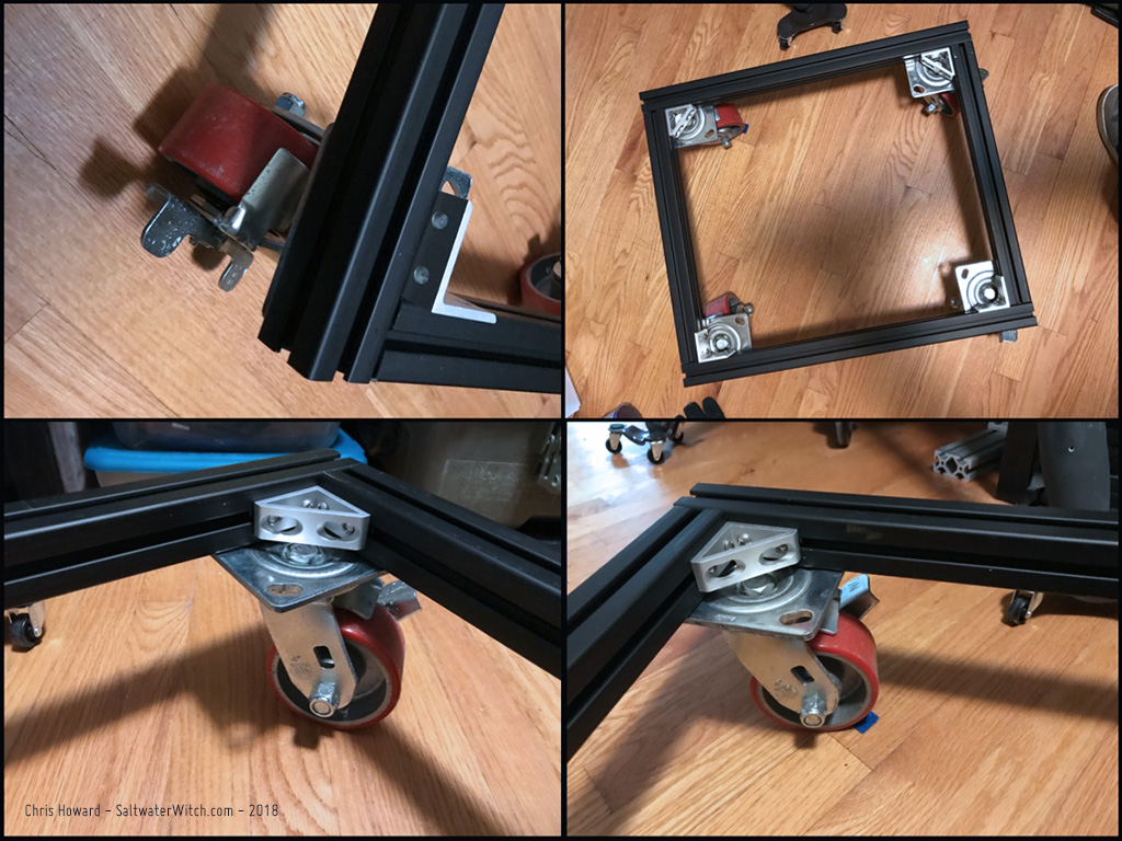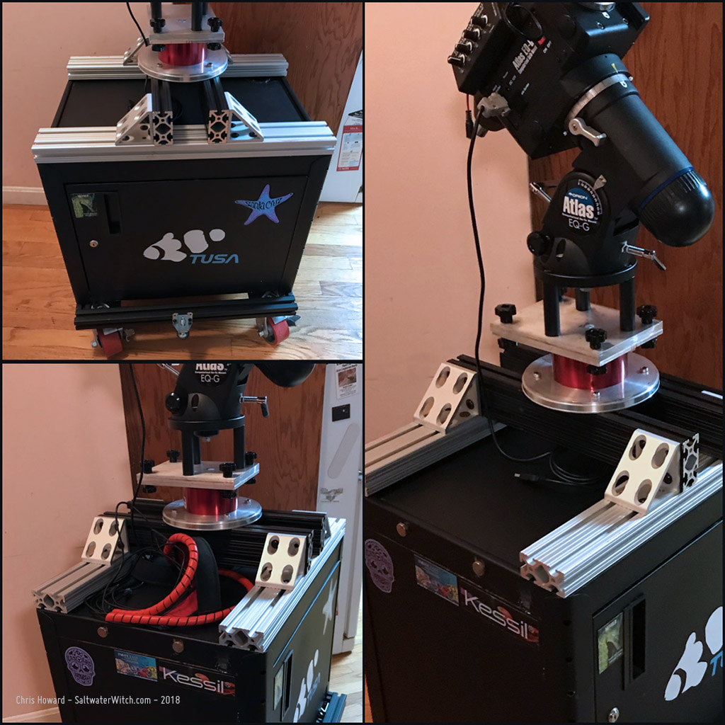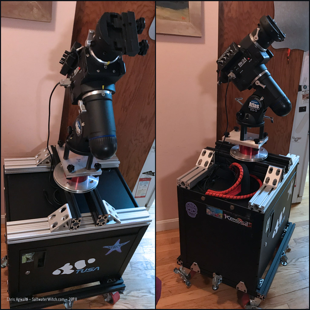 I started this--the top part with the pier made of 80/20 Series 15 T-Slot Aluminum beams and angles--about a year ago, or maybe longer. I never really used it though, because I needed some place level to anchor it. Taking some more t-slot beams I made a base for some super-duty castors and bolted an old steel AV Cart cabinet to it. This has become the base for my next set of astro sessions, where I will be wheeling this out to the driveway, leveling it (threaded leveling adjustments on each side), polar aligning, and then we'll see how the astro imaging goes. I'm looking forward to getting more of the western sky, most of which is blocked by the house when I'm shooting from the backyard.