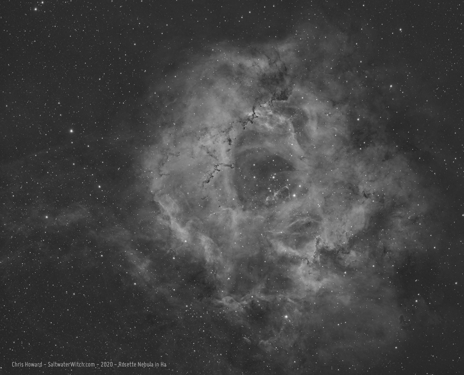 From the imaging run last night. The Rosette Nebula (NGC 2237) in the Constellation Monoceros is another deep sky object I typically capture every year--at least once! Trailing Orion across the sky, it's over a 100 light-years across and about 5000 lightyears away from us. 50 x 240 second sub-exposures in Ha. Gear notes: SkyWatcher EQ6-R Pro mount, William Optics GT81 Apochromatic Refractor 392mm at f/4.7, ZWO ASI1600MM-Pro monochrome camera, Astronomik 6nm filters, Moonlite focuser, Raspberry Pi 4 4GB / 128GB running INDI/KStars/Ekos