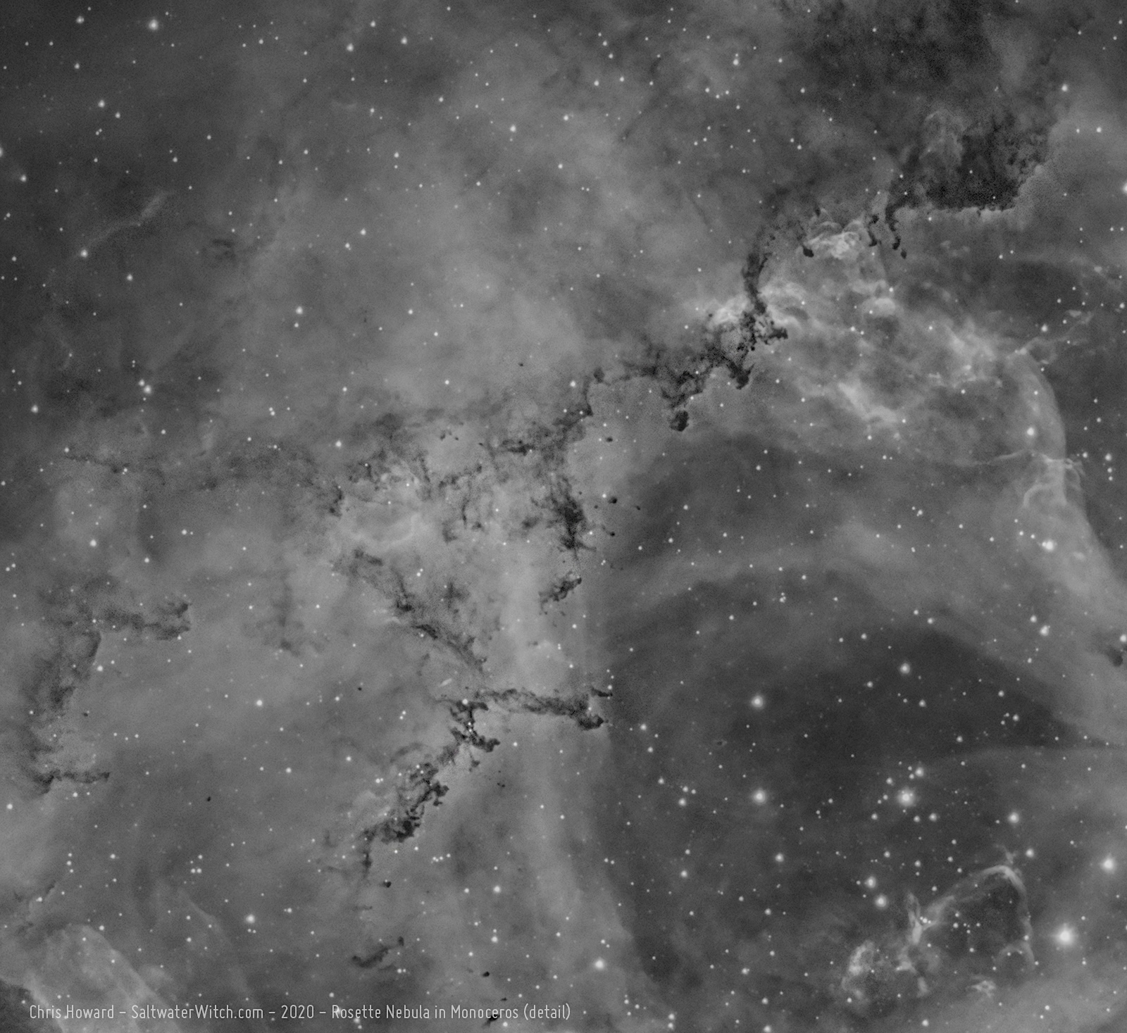Rosette Nebula in the Constellation Monoceros (detail). You're looking at about 360 trillion miles of globules and globulettes—all those dark cloudy bits, running from the bottom middle of this frame to the top right. This is a detail view of my last Hydrogen-alpha image of NGC 2237 where interstellar gas and dust around one side of the Rosette Nebula have condensed into strings of dark cloudlets that block the emission from the core group of stars lighting up the broader background. Several of the stars that make up the cluster NGC 2244 are massive super-hot O-type stars, and these produce the stellar winds and intense radiation that have shaped the Rosette Nebula. To give you a sense of the scale here, pick any of the branches in those dark cloudy structures, or even most of the loose globules of condensing hydrogen. Our entire solar system can easily fit within the width of one of these. And I'm not talking about the orbit of Pluto; I'm using the Oort Cloud as the defining boundary, which would make the diameter of our solar system roughly 1.5 lightyears. In other words you can fit about 240 of our solar systems, lined up one after the other, in the same space as this chain of dark clouds. William Optics GT81 @f/4.7 Astronomik 6nm Ha filter, ZWO ASI1600MM-Pro mono camera.