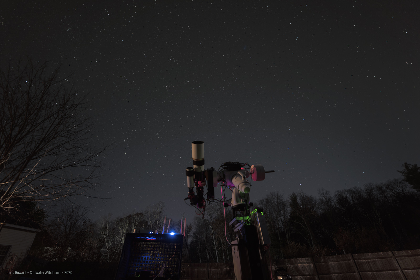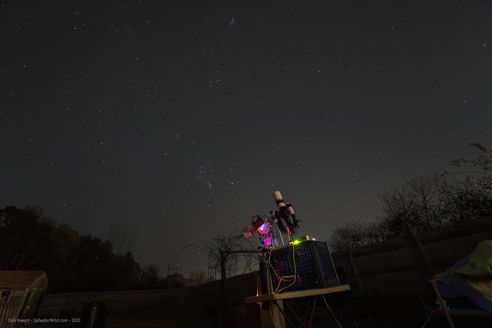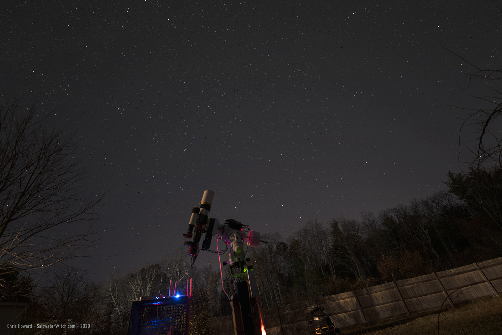 Wow, we actually have a pretty decent view of the universe from our backyard. Notes: Nikon D750, Irix 15mm f/2.4, 30-second exposures. That's Ursa Major, the Big Dipper, to the right of the scope, that upside down W in the tree branches is Cassiopeia, and that bright star between them, a little to the left of where the scope is pointing, is Polaris, the North Star.