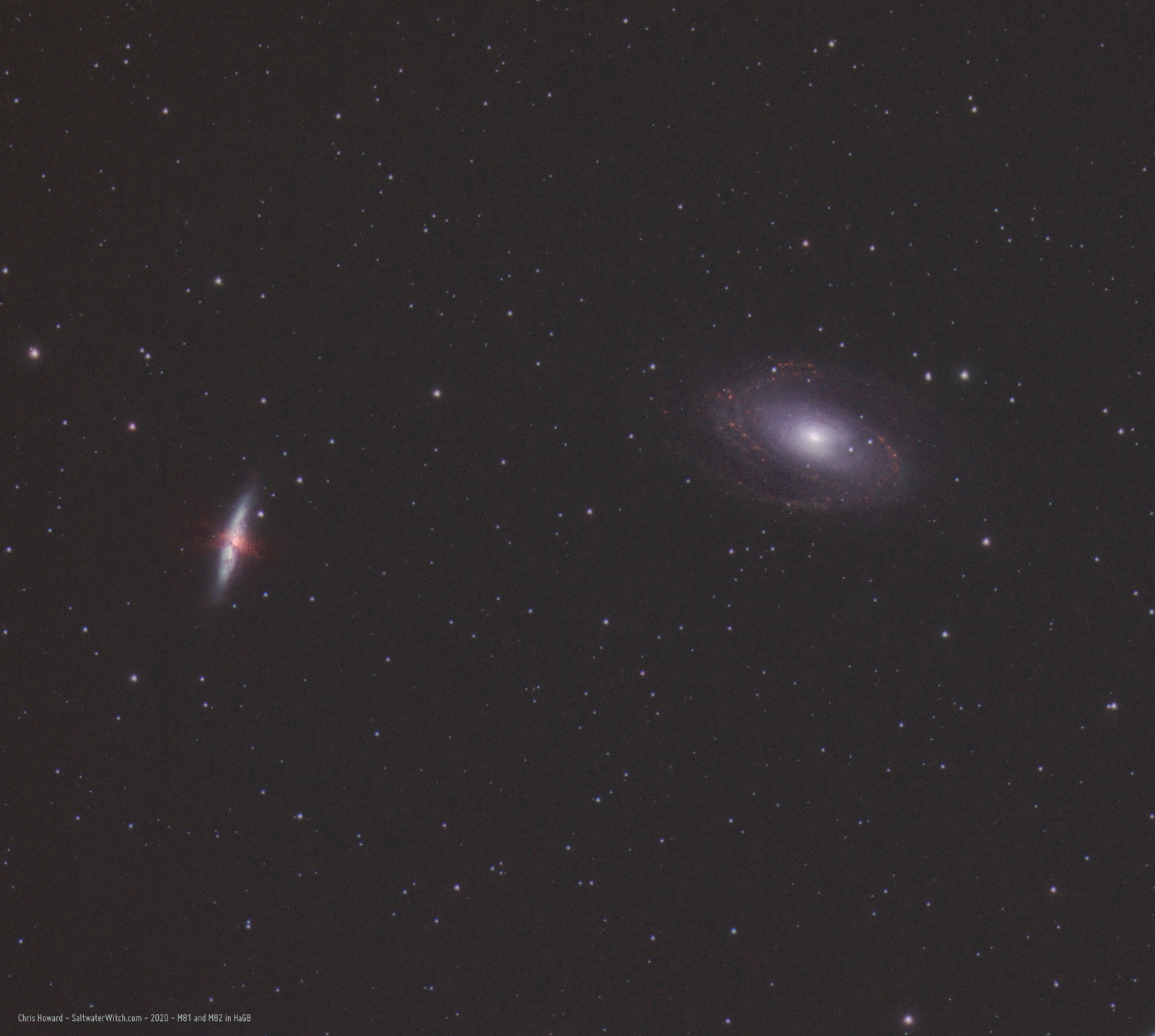 After the earth rotates Orion and Monoceros out of view in the south, I'm only left with a few nebulae. There are a bunch of galaxies though... But with the scope I'm using for large deep sky objects (William Optics GT81 with 392mm focal length), most are too small. M81 (Bode's Galaxy) and M82 (Cigar Galaxy) however, are just large enough to capture. This shot is made up of 30 x 60-second subs in Hydrogen-alpha, Green, and Blue filters that I've mapped to RGB. With the Ha filter you lose some of that broadband Red light, but the trade-off (better IMO) is you capture any large H2 regions in the galaxies. Those are the red and pink chunky bits in Bode's Galaxy and a lot more of that "starburst" core of the Cigar Galaxy—so, basically I'm capturing nebulae in someone else's galaxy, almost 12 million lightyears away from us. Cool. Both of these Messier Objects are in the Constellation Ursa Major (Big Dipper). Gear notes: SkyWatcher EQ6-R Pro mount, William Optics GT81 Apochromatic Refractor 392mm at f/4.7, ZWO ASI1600MM-Pro monochrome camera, Astronomik 6nm filters, Moonlite focuser, Raspberry Pi 4 4GB / 128GB running INDI/KStars/Ekos