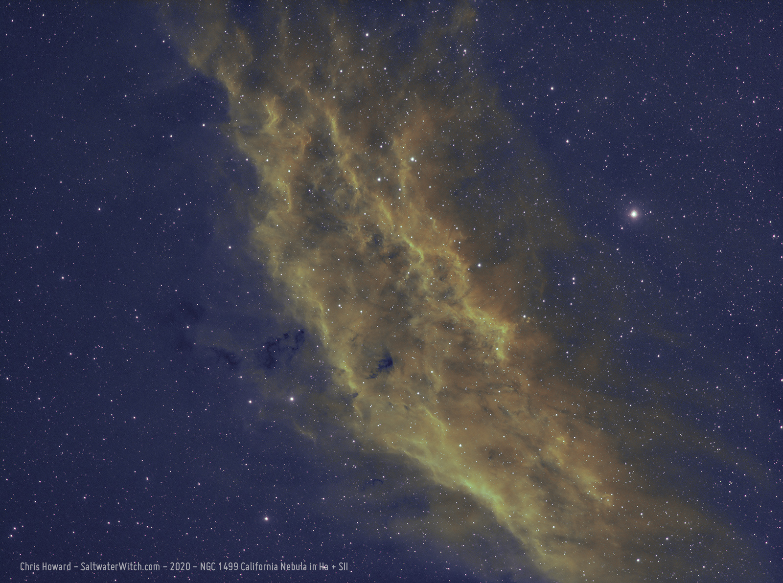 Tuesday night I captured 50 x 4-minute sub-exposures in Hydrogen-alpha for NGC 1499 (California Nebula) and last night I captured 60 x 240 second exposures in Sulfur 2 (SII), combining them here into a color image, with Ha in red, SII in blue, and each shared equally across the green channel of an RGB image. There just isn't any OIII (Oxygen) in the mix for this massive emission nebula in the Constellation Perseus. Gear notes: SkyWatcher EQ6-R Pro mount, William Optics GT81 Apochromatic Refractor 392mm at f/4.7, ZWO ASI1600MM-Pro monochrome camera, Astronomik 6nm filters, Raspberry Pi 4 4GB / 128GB running INDI/KStars/Ekos