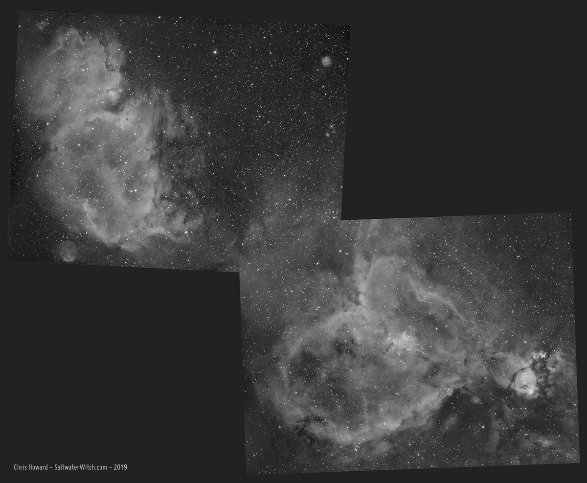 I moved over to Cassiopeia and shot 40 x 4-minute subs each of IC 1805 (Heart Nebula) and IC 1848 (Soul Nebula) in Hydrogen-alpha. Here's the stitched together pair: