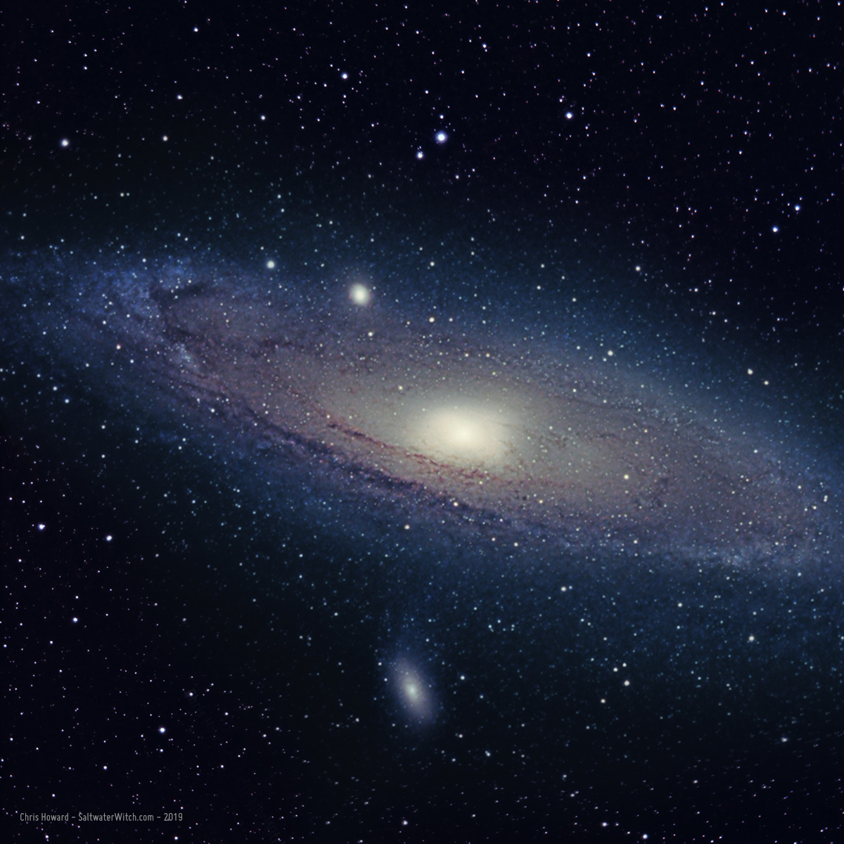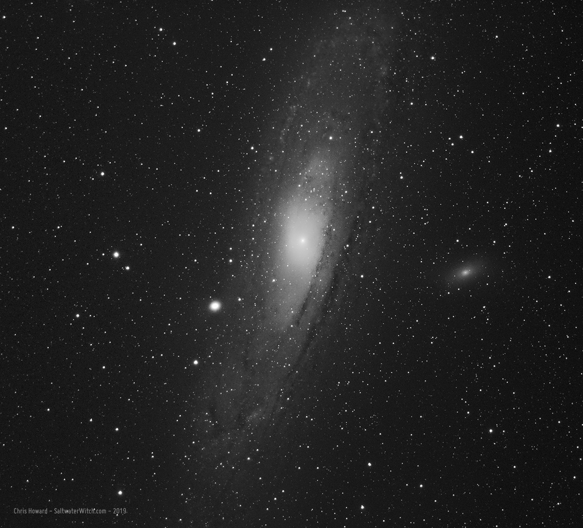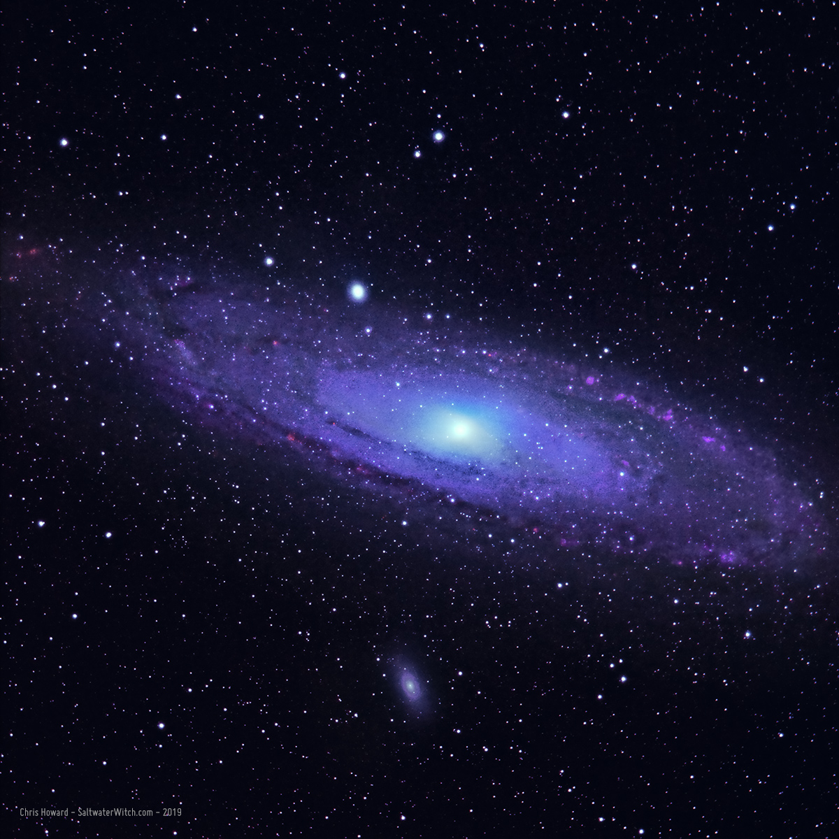 The Andromeda Galaxy (M31) is our largest and most magnificent galactic neighbor, about 2.5 million light-years away from earth (or 780 kiloparsecs if you're of a more serious demeanor). Here's my bi-color version in near-IR and hydrogen-alpha. With a 685nm IR longpass filter I have managed to get a ring in M110 (NGC 205) the dwarf elliptical galaxy and satellite of Andromeda (center bottom). Wasn't expecting that. I am assuming the rings are an artifact of processing or cut-out gaps between bandpasses in the filtering because M110 is an elliptical galaxy, which are evenly distributed bundles of stars without arms or distinguishable belts like a spiral galaxy, e.g., M31, Milky Way.