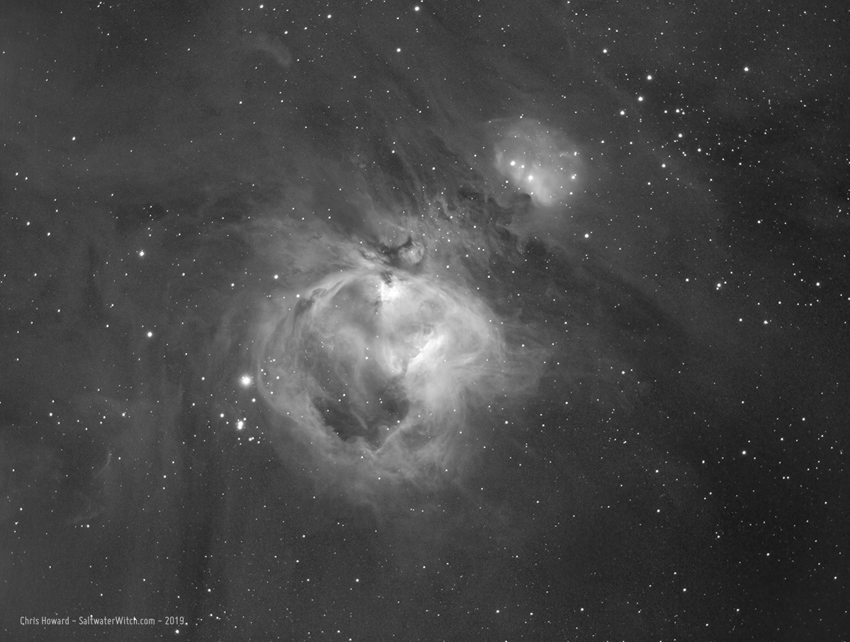 And Orion is back in the sky! Sure, you have to get up at 3 in the freakin' morning to see it with your own eyes. Or you can program your astro imaging system to stay up all night and take pictures without you. Here's M42, Orion Nebula, along with M43, De Mairan's Nebula--that's the spherical-looking cloud formation with the big bite taken out of it. And above that, shining brightly, Sh2-279 Running Man Nebula--although the famous running man shape isn't clear in hydrogen alpha. I'm not sure how well it comes out with oxygen III and sulfur II, but I'll come back another night to capture the OIII and SII frames. Notes: 31 x 240 second exposures in Ha + 20x 10 second subs just for the Trapezium (the super bright core of the Orion Nebula--so bright I have to take separate short exposure shots and merge it back in processing). William Optics GT81 APO refractor, ZWO ASI1600MM-Pro mono camera, Astronomik 6nm Ha filter.
