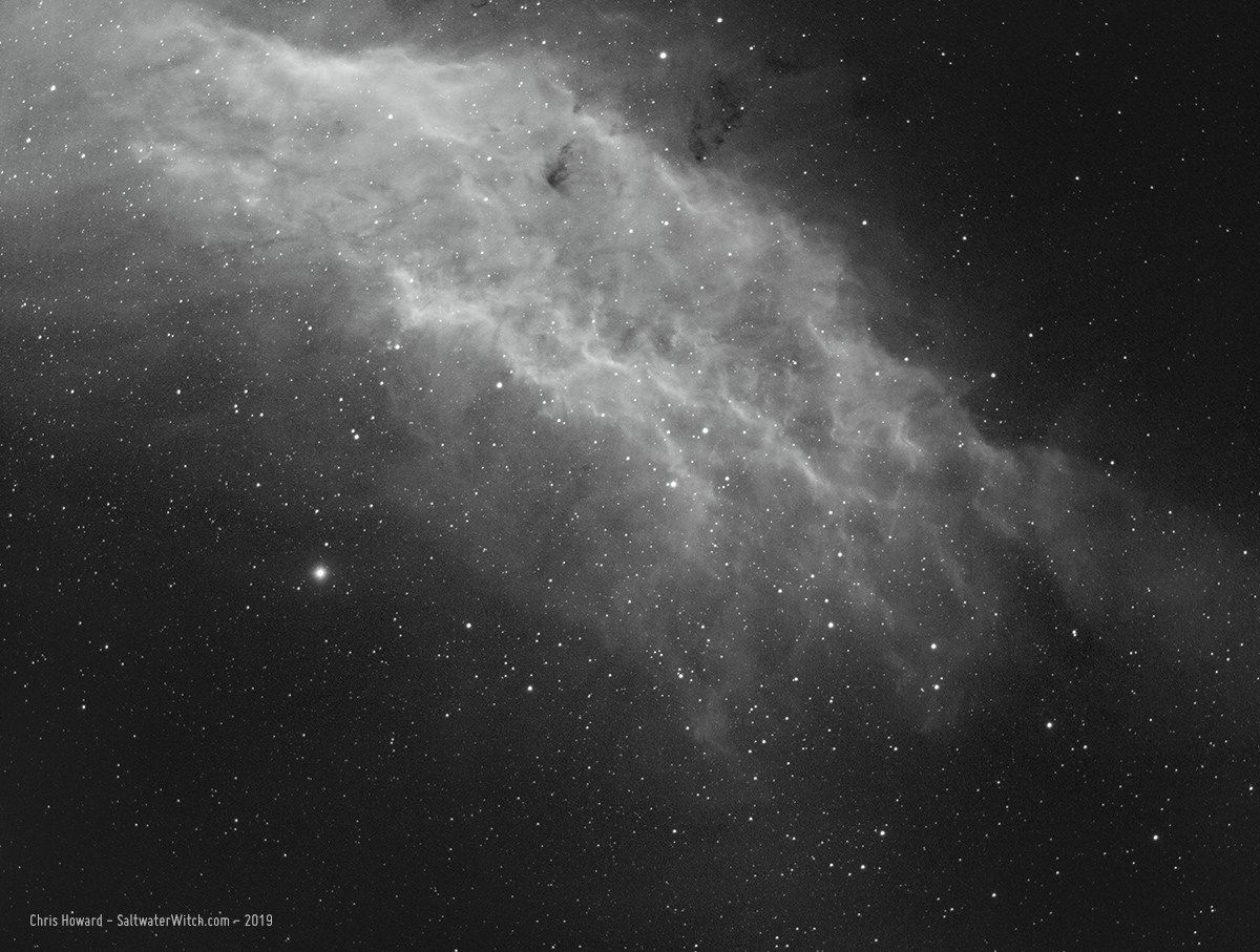 Here's a stack of 10 subs of NGC 7000, North America Nebula in Cygnus, with a bit of the surrounding region including the Pelican Nebula. This is 10 x 240 second exposures stacked in DSS--no calibration frames, shot with a William Optics SpaceCat 51, ZWO ASI1600MM-Pro mono camera, and Astronomik 6nm Hydrogen-alpha filter. I'm using an Orion Thin Off-axis Guider and ZWO ASI120M-mini with this train, and guiding was spectacular. I didn't crop or do anything crazy with this stack, just normal processing in Photoshop CC 2019.