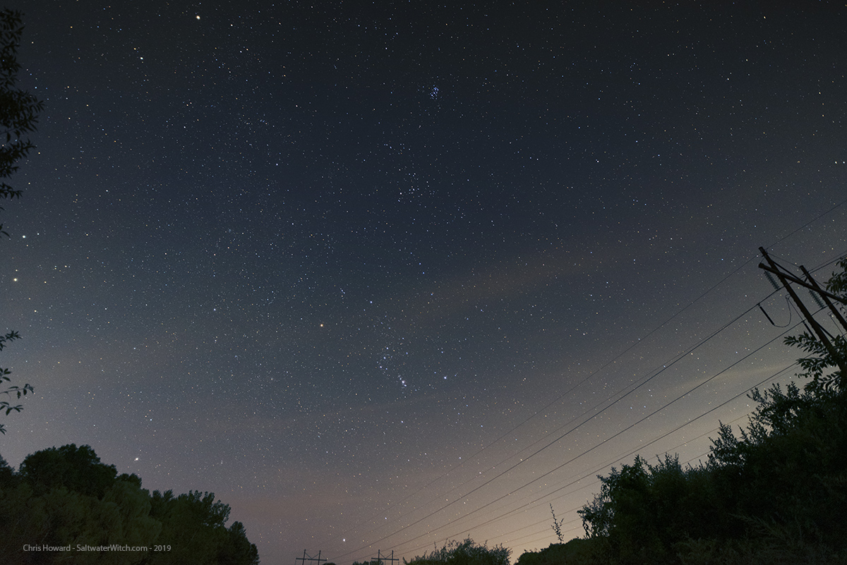 Autumn is officially here, and this is the season of the Pleiades, Orion, the nebulae in the constellations of Perseus, Monoceros, Auriga, Taurus, and Gemini. Now, M42 isn't in view until 2am, so that had to be the last in the sequence. And, yes, you can tell I was just dorking around with filters with our galactic neighbor, Andromeda M31, in near IR and hydrogen-alpha. I know M31 is a decent Ha target, and you can see some wonderful images in Ha-RGB out there in the world, but I had never tried shooting 2-minute subs of M31 with a 685nm long pass filter.