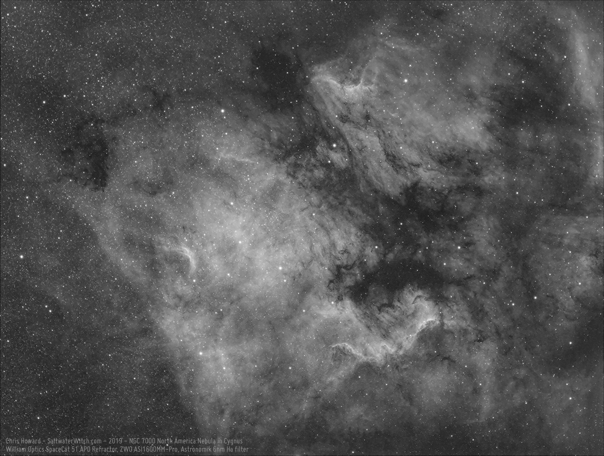 NGC 7000 (North America Nebula), IC 5070 (Pelican Nebula) and IC 5068 (lower right) are all part of the same HII region in the constellation Cygnus. NGC 7000 is about 2600 lightyears away in the Orion Arm of our the Milky Way. With this field of view, we can see over 140 trillion miles of clouds of interstellar ionized hydrogen, lit by the massive binary star HD 199579, located approximately where Chicago would be. The dark bands and filaments of dust in front of these vast glowing clouds (LDN 935, B 352, 356) help form the eponymous North America shape, blocking out a large region for the "Gulf of Mexico", running up the "East Coast" and across the "Northeast Passage".