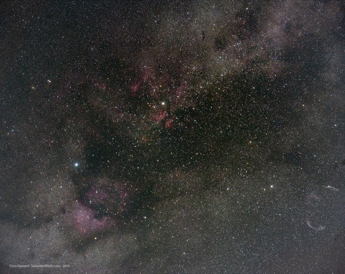 Cygnus region of the Milky Way, with NGC 7000 North America nebula at the bottom left, the Sadr Region in the center, and it's crazy how much of the Veil Nebula showed up--that's the ring of wispy, mostly white nebulosity on the right toward the bottom. The reddish/pinkish areas are mostly clouds of hydrogen gas, while the pale cloudy areas are mostly stars--so many stars. Our galaxy contains somewhere between 150 and 250 BILLION stars. 3 x 120 sec exposures, Nikon D750 85mm f/5.6, on an iOptron SkyGuider Pro tracker.