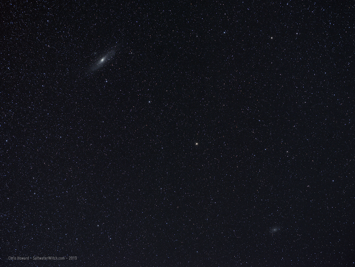 I didn't have much time last night, so I just went with the Nikon D750 + 70-300mm lens on the iOptron SkyGuider Pro. And shot 20 exposures of M31. I was actually just wheeling the camera around the sky, adjusting focus at 70mm when I saw Andromeda Galaxy in the upper left, and there was M33 Triangulum in the lower corner. This is cropped from the full image, and I probably could have framed these better, but I didn't feel like pushing my luck. M33 was down by the bottom edge. So I went with this, 20 stacked frames in DSS: