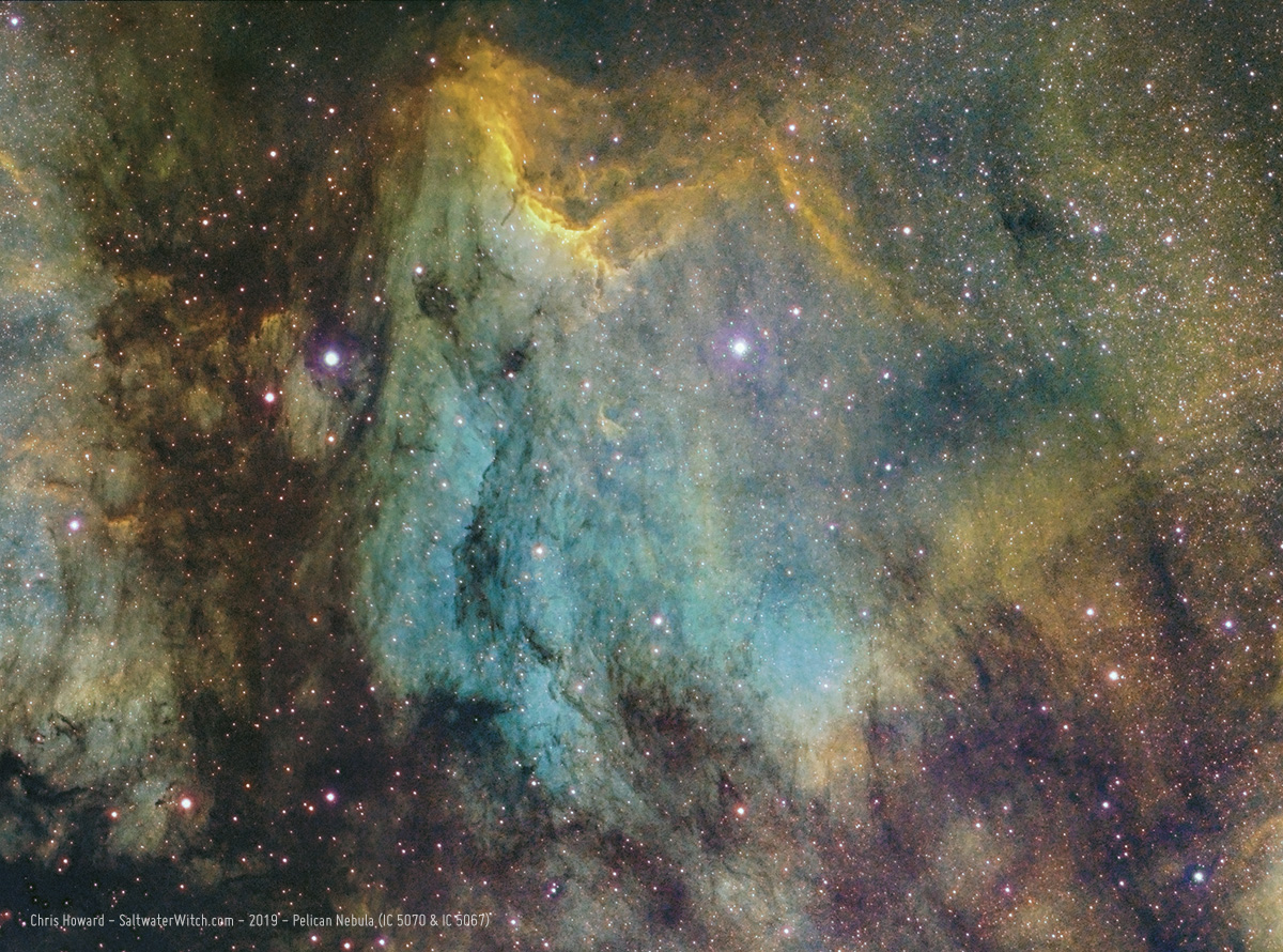 Another one from my June 8th narrowband imaging run through the constellation Cygnus. The Pelican Nebula ( IC 5070 and IC 5067) in sulfur 2, hydrogen-alpha, oxygen 3, mapped to RGB.