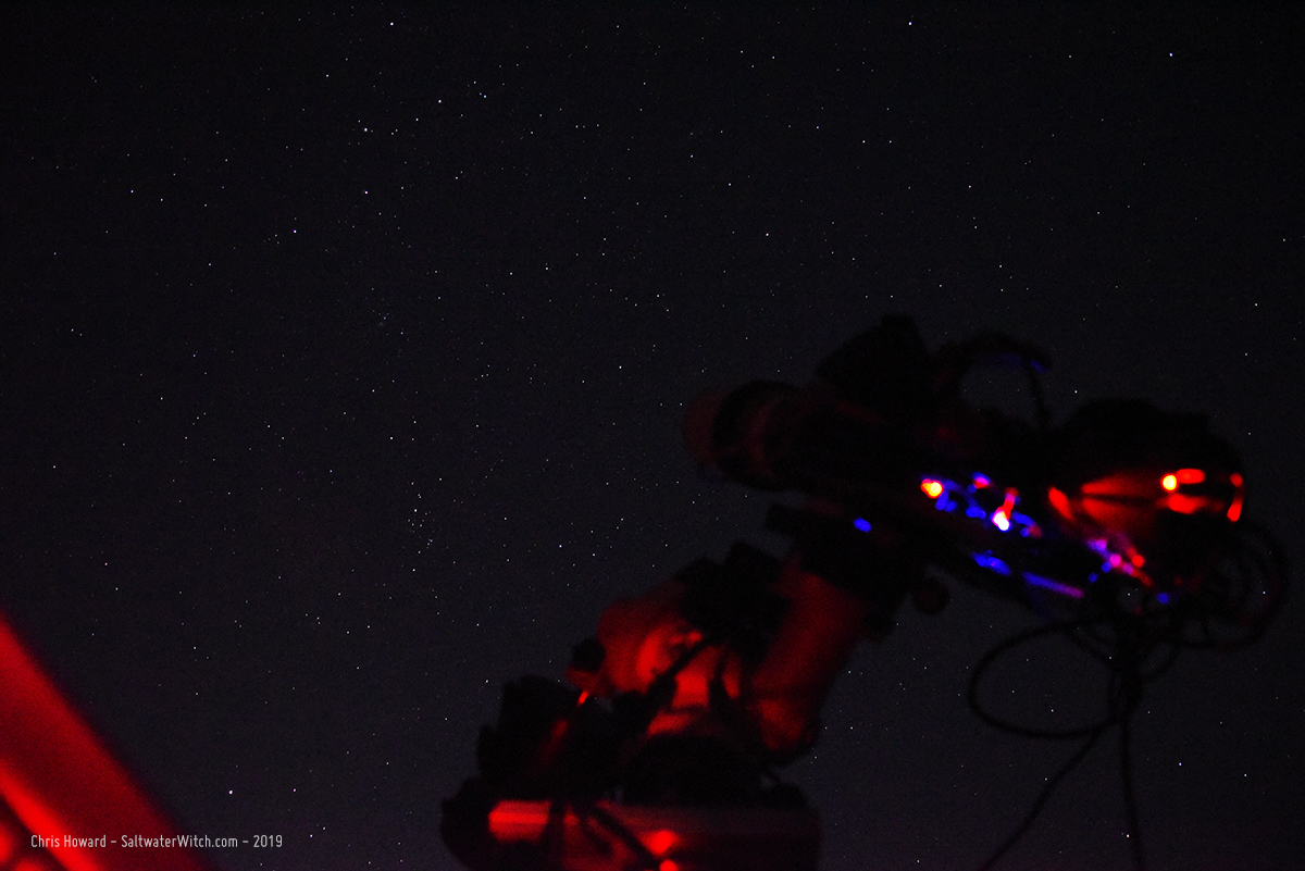 I woke up around 3:30 am and went out to check on the night's imaging run. I was in the middle of the sulfur2 frames when I took this shot with the Nikon: the William Optics GT81 APO refractor pointed at Cassiopeia (top left), actually just below it, which is where you will find IC 1848, the Soul Nebula. Just so you are aware, this is all automated--slewing, plate solving, focusing, filter rotation, and image capture. Once I plot and schedule an imaging run, the last place I want to be is near the telescope where the slightest motion in the ground can ruin a good 5-minute exposure. I was just out there to look at the beautiful sky, and take some crappy blurry photos of my astro gear against the starry background.