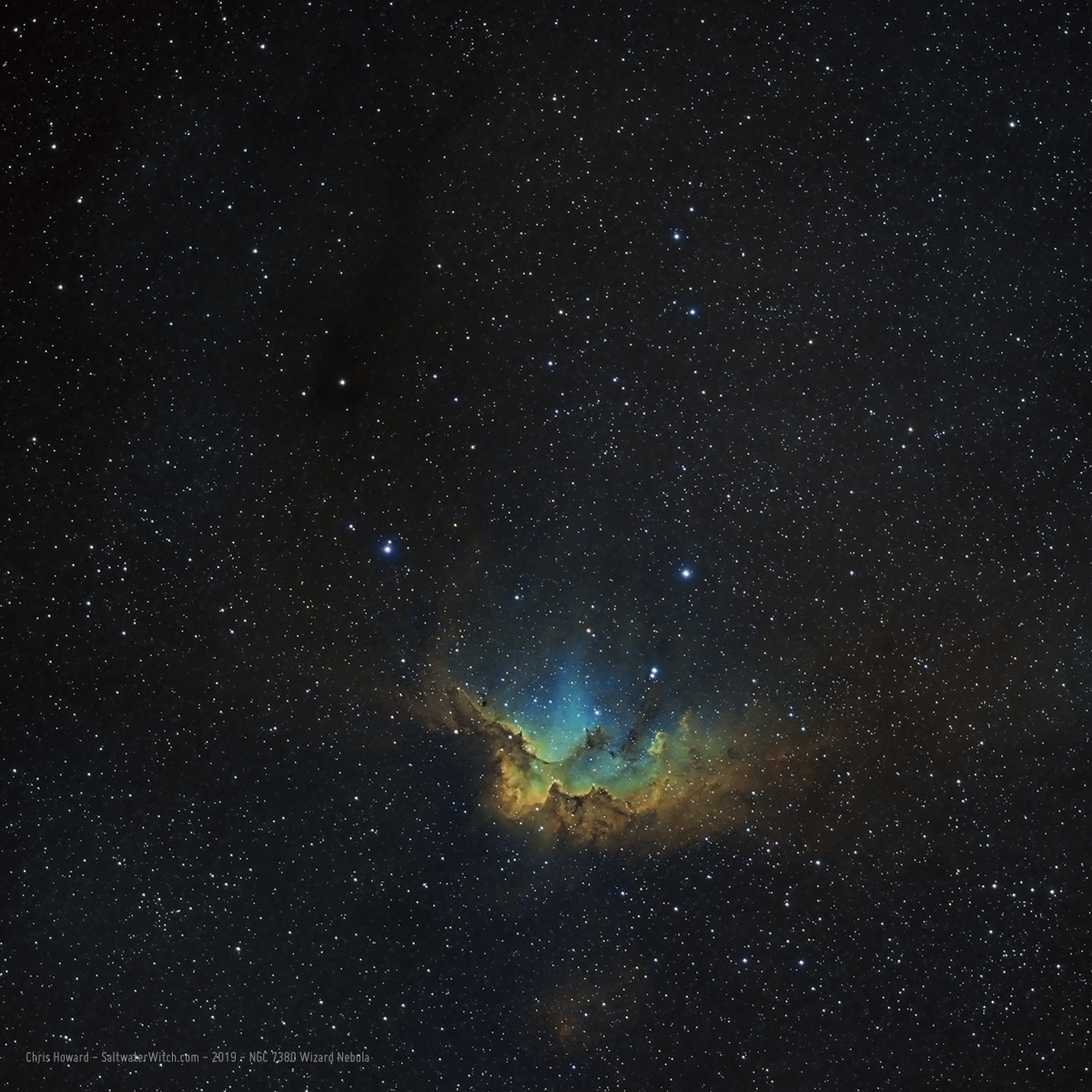 I captured the Ha data for the Wizard Nebula early in July, and now I have enough to process in SHO (Hubble Palette) that's where we map the three bandpasses, sulfur (SII), hydrogen (Ha), and oxygen (OIII) to RGB, Red, Green, Blue to make up a color image.
