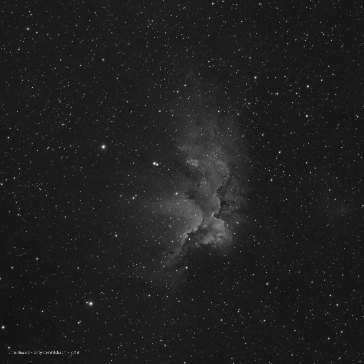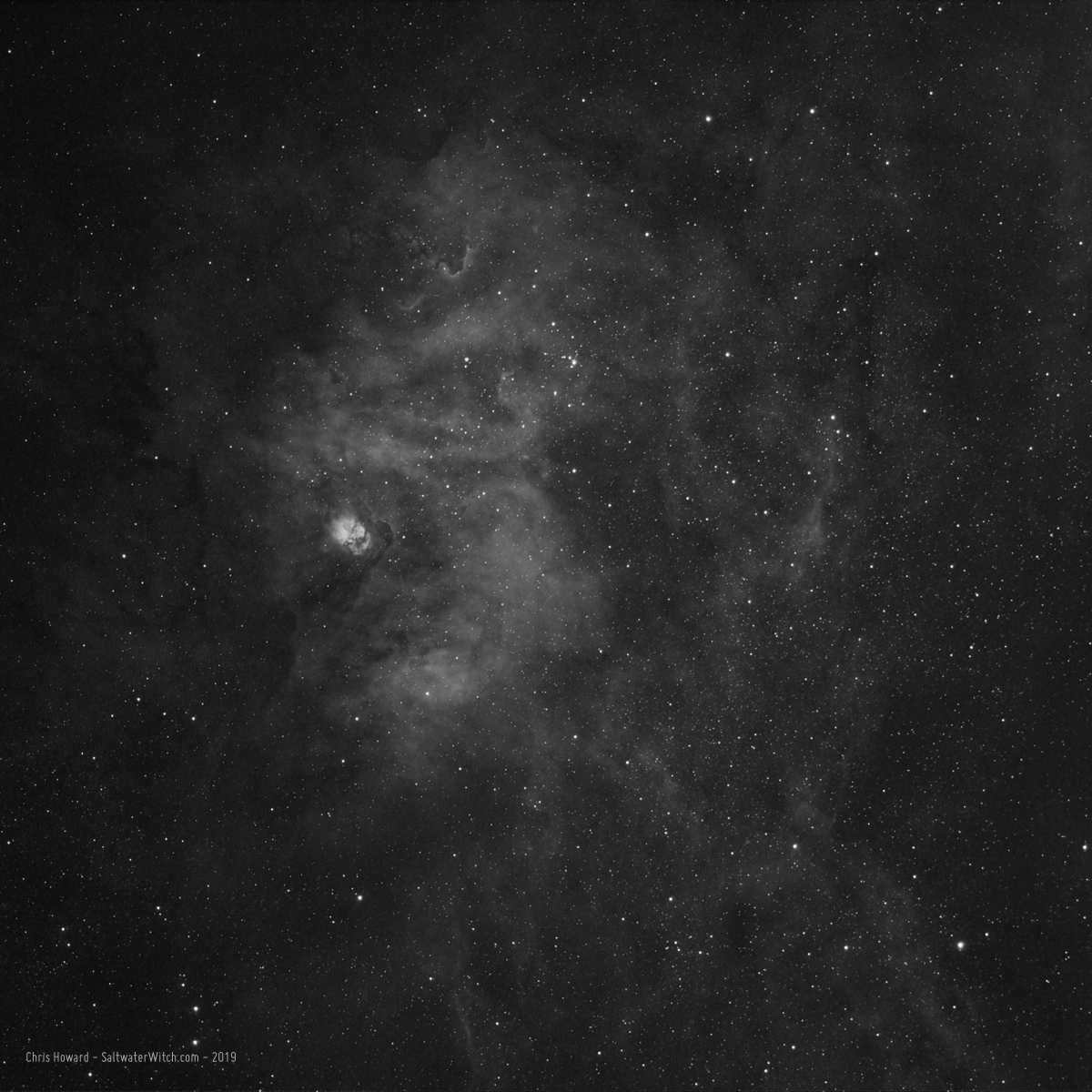 The nebula Sh2-54 is about 5000 lightyears away in the constellation Serpens. It's part of a long band of nebulosity that extends almost ten degrees through the Eagle Nebula (M16) and Swan/Omega Nebula (M17) below that. NGC 6604 is the cluster of stars above and to the right of the brightest knot of the nebula. Imaging notes: 30 x 180 sec Ha sub stacked in DSS and processed in Photoshop CC.