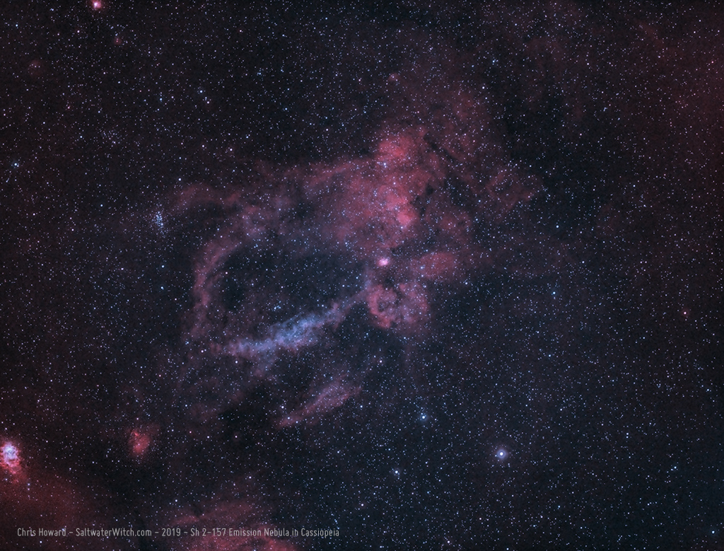 The "Lobster Claw Nebula" (Sh 2-157), an emission nebula in Cassiopeia, and Sh 2-157a a ring nebula around the Wolf-Rayet star WR 157. I finally captured hydrogen-alpha and oxygen-3 frames for one of my favorite Sharpless catalogue objects. I will come back later in the year to get better OIII frames and an SII set. I didn't get to the underside of Cepheus--or the borderlands between Cepheus and Cassiopeia until 1:30 am, and by then I only had an hour and a half of astronomical night left. This time of year the sky begins brightening at 3:30am, which makes it tough to get to some of these later objects.