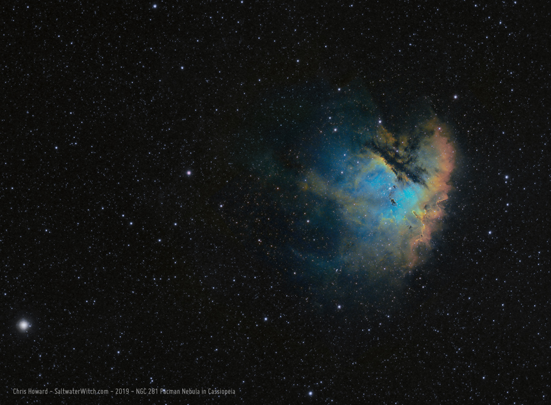 NGC 281 Pacman Nebula - I'm finally getting around to processing a bunch of data I gathered over the last month and a half. Pacman is one my favorite nebulae in Cassiopeia. I love that it's out on its own, surrounded by cold dark space and a field of stars. NGC 281 also has an impressive set of Bok Globules, those dark gaseous knots drifting in front of the bright blue and gold (oxygen and hydrogen). And that's Achird (eta Cassiopeia) at the bottom left, a variable double star a little under 20 lightyears away. Damn, that's nearly close enough to visit--with the right technology.