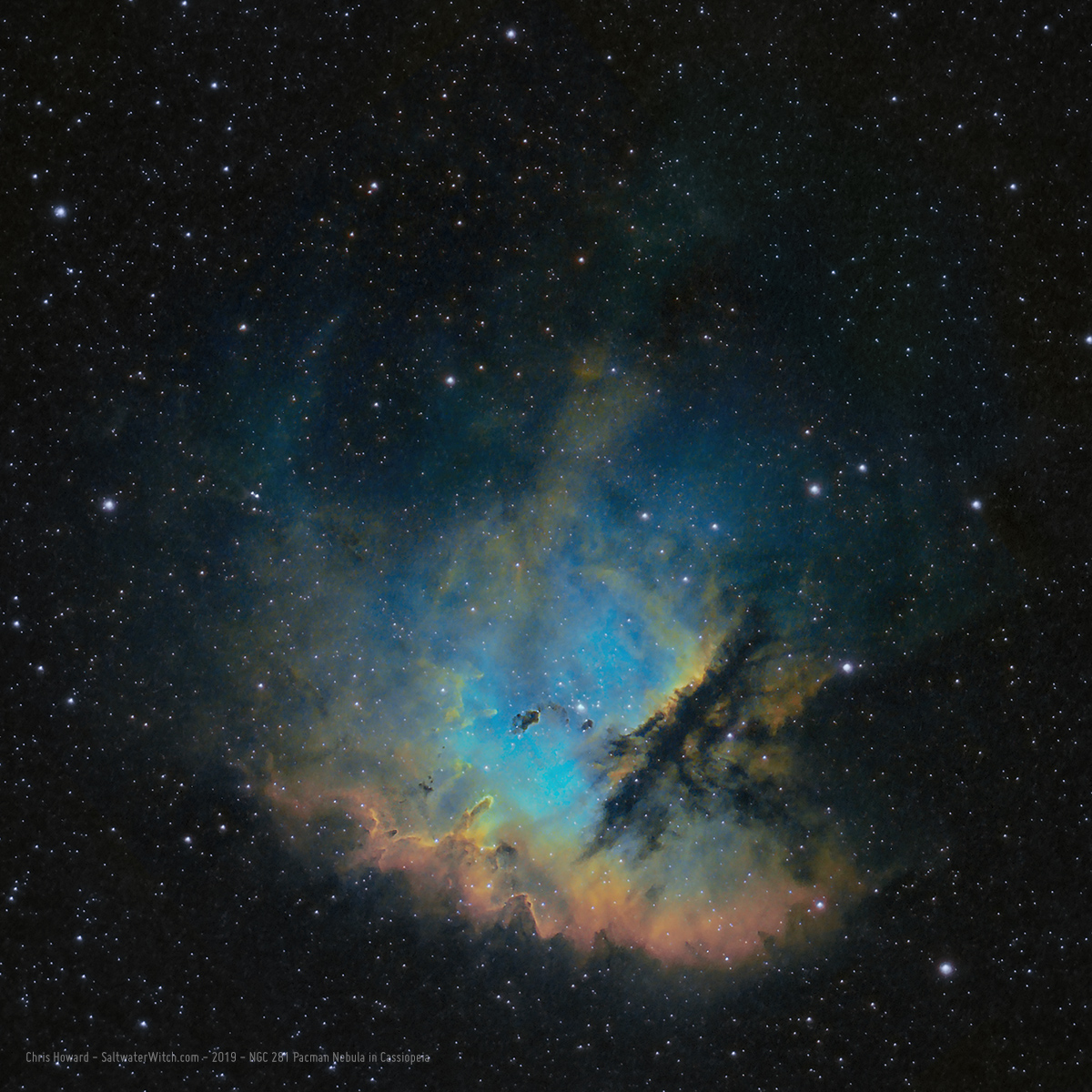 Another one of the Pacman Nebula NGC 281, with narrowband data I started taking in early June. You can really see the Bok globules, those little lumps of dark dust and gas standing out near the center and backlit by the bright emission of the Pacman. https://en.wikipedia.org/wiki/Bok_globule