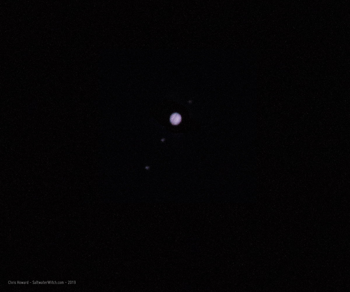 What's cool, is Jupiter is just up along the ecliptic from the moon, and I swung the same setup there and captured a very dim shot of our system's largest planet along with three moons, Europa, Io, and Ganymede.